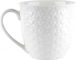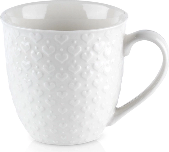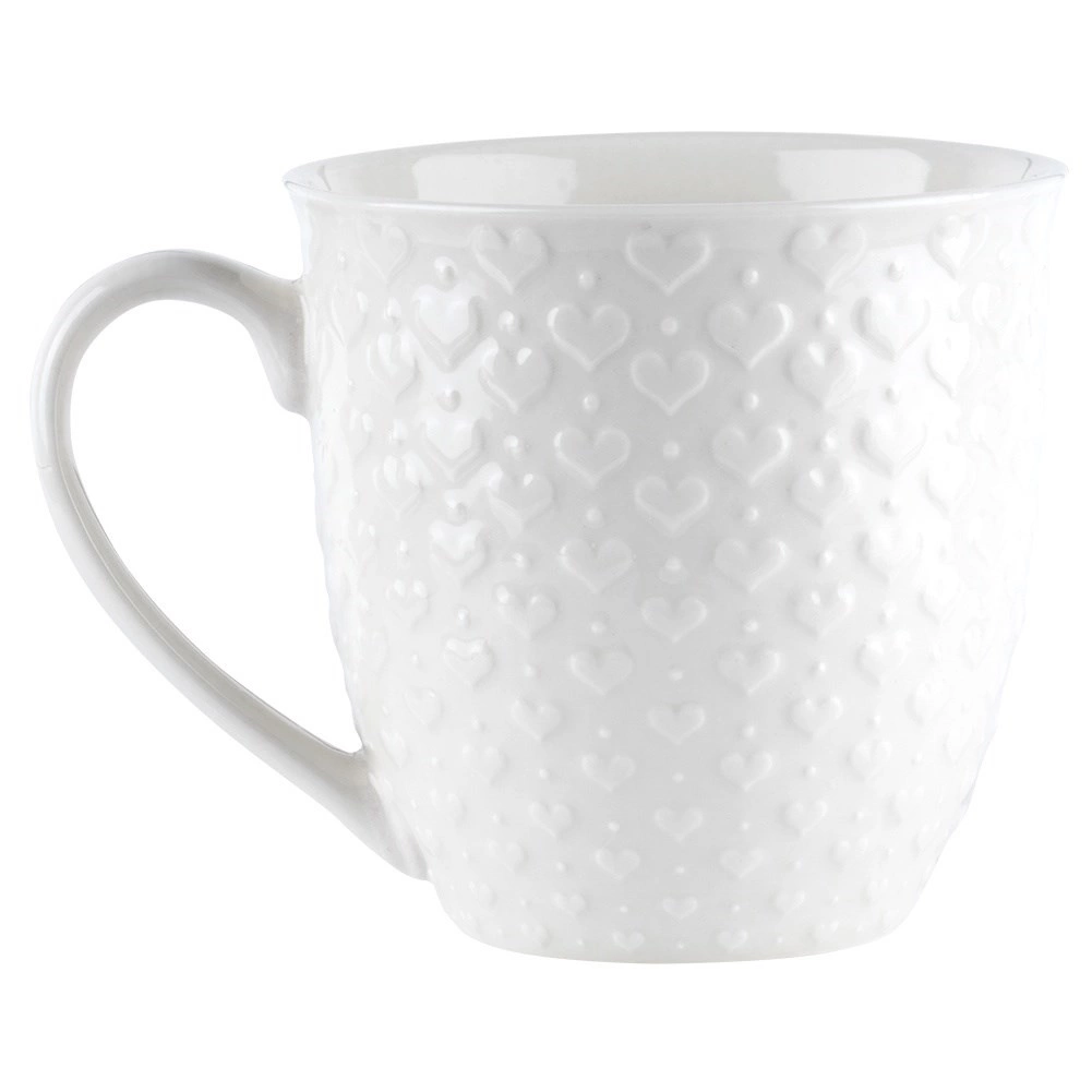Geniet van je favoriete koffie of thee met de royale inhoud van 580 ml. Deze witte keramische mok met een reliëfdecor van hartjes combineert een elegante uitstraling en praktisch gebruik voor dagelijkse genietmomenten. Het ergonomische oor ligt prettig in de hand en zorgt voor een zekere grip.