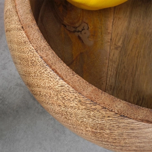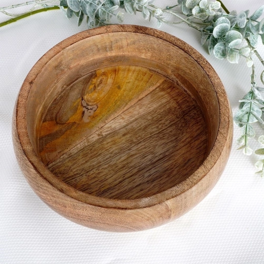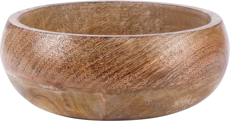Stijlvolle houten schaal van exotisch mangohout met een diameter van 18,5 cm en een inhoud van 900 ml, ideaal voor het serveren van snacks, fruit en decoratieve arrangementen. Valt op door de natuurlijke houtnerf, vochtbestendigheid en universele inzetbaarheid in keuken en eetkamer. Een geweldige keuze voor dagelijks serveren en als elegante interieuraccessoire.