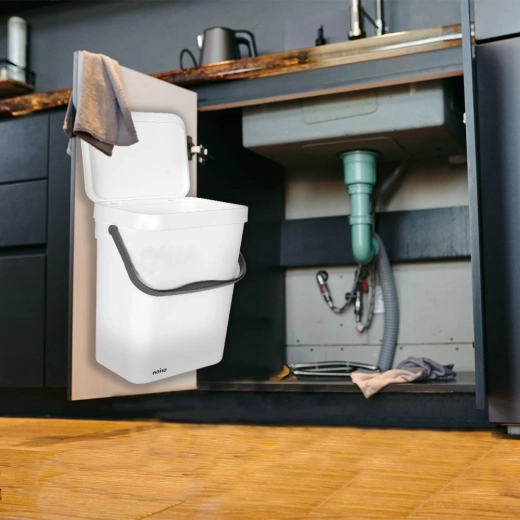 Praktische hangende prullenbak met een inhoud van 10 l in witte kleur, met klapdeksel en stevig handvat voor eenvoudig dragen. Bespaart ruimte, verbergt afval en helpt de keuken schoon te houden. Dankzij de mogelijkheid om aan de muur of aan kastdeuren te monteren is hij ideaal bij de gootsteen en voor kleinere ruimtes. Duurzame kunststof, een effectief deksel tegen geurtjes en eenvoudige installatie maken deze bak een uitstekende keuze voor elk huishouden, ook te gebruiken als compostbak voor thuis.