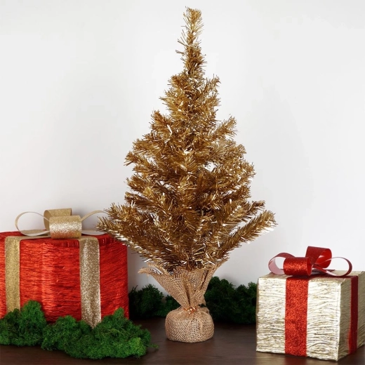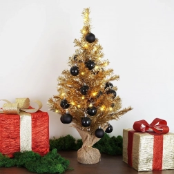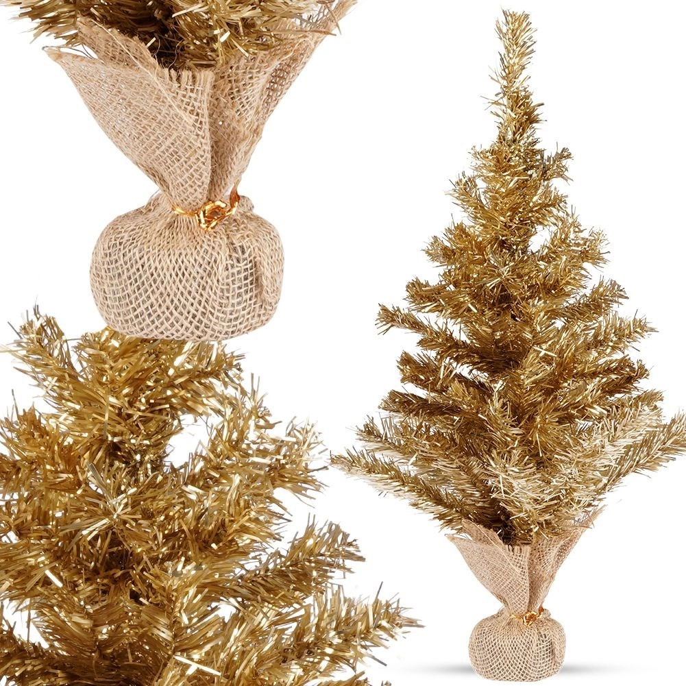 Deze compacte kunstkerstboom in luxueus goud past perfect in huis, kantoor en kleinere ruimtes. Dankzij de stevige metalen kern en de stabiele betonnen basis met jute omhulsel staat hij veilig en plaats je hem gemakkelijk op een tafel, plank of vensterbank.