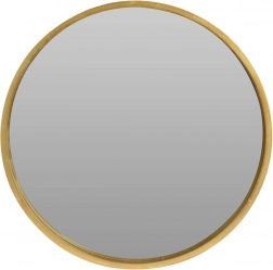 Stijlvolle wandspiegel met een diameter van 50 cm, geplaatst in een robuste houten lijst in goud. De minimalistische vorm en de luxe tint van de lijst maken er een opvallend accessoire van dat het karakter van je woning én commerciële ruimtes benadrukt.