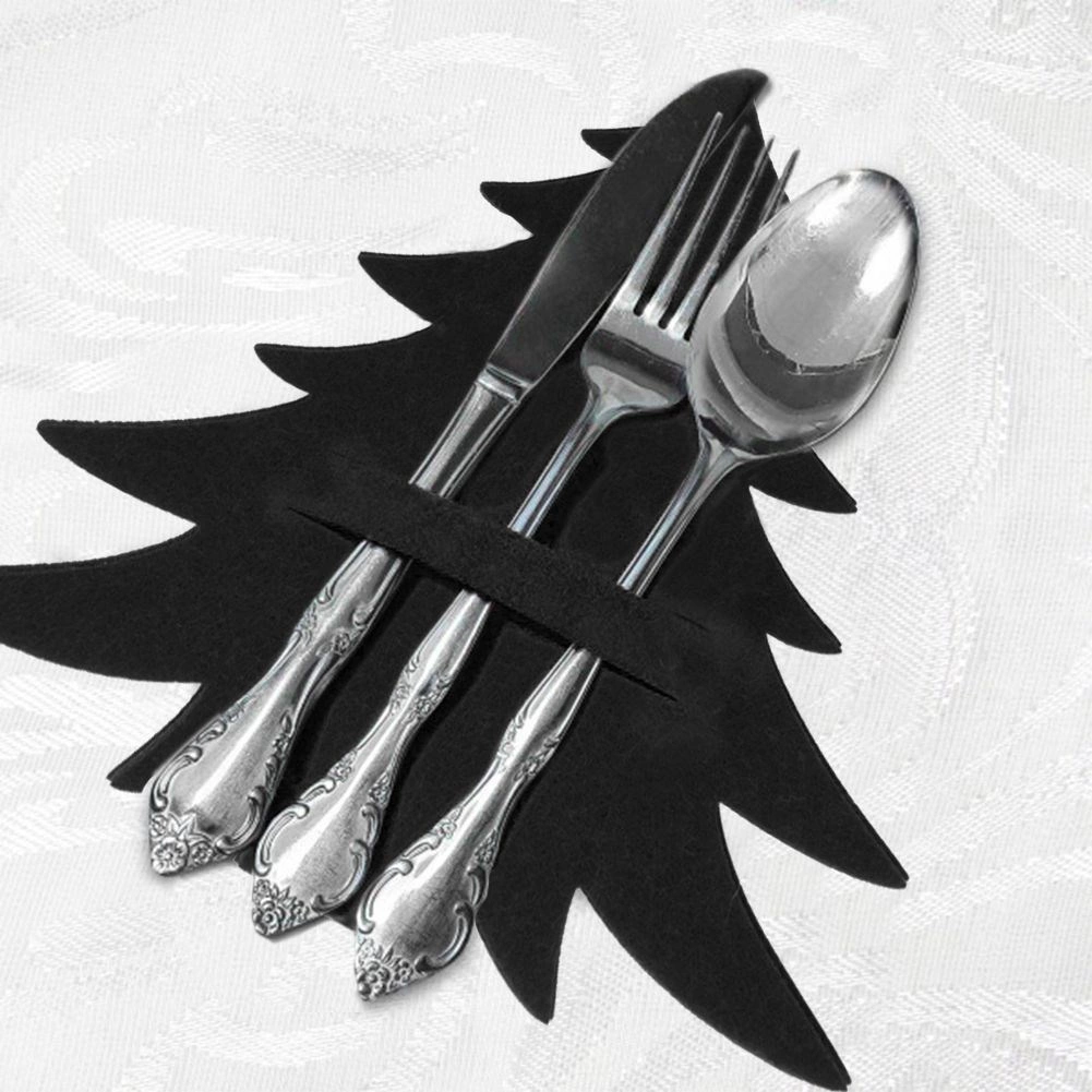 Creëer thuis een unieke kerstsfeer met bestekhoesjes in de vorm van een boompje. Zwart vilt geeft de tafel een moderne, contrasterende look en past bij elke feestelijke decoratie en elk servies. Praktische sleuven houden de volledige bestekset stevig op zijn plaats en presenteren die elegant.