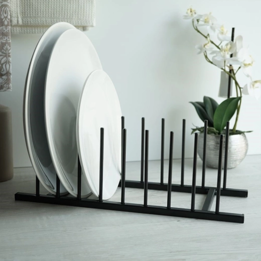 Praktische keukenorganizer voor het overzichtelijk opbergen van tot 8 borden of deksels in een rechte verticale positie. De duurzame metalen constructie in het zwart past bij een moderne industriële stijl en helpt ruimte te besparen in lades en kasten, beschermt servies tegen krassen en maakt drogen en organiseren makkelijker.