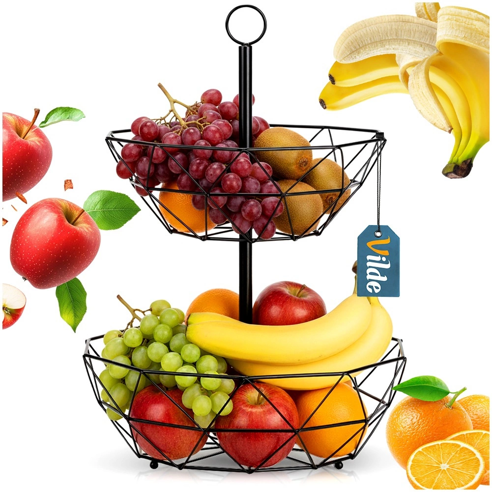 Elegante tweelaagse mand voor fruit en groenten van zwart metaal bespaart ruimte op het aanrecht en houdt etenswaren langer vers dankzij het luchtige draadontwerp. De stijlvolle geometrische vorm past in moderne, industriële en glamour interieurs, terwijl de stabiele constructie en praktische afmetingen het dagelijks gebruik en reinigen vergemakkelijken.