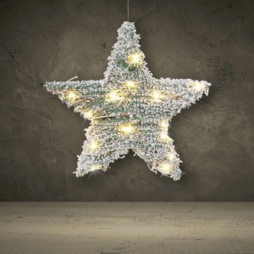 Deze decoratieve kerstster combineert een natuurlijke rotanlook met kunstmatige naaldtakjes met sneeuweffect. De geïntegreerde warm witte LED’s lichten de vorm van de ster gelijkmatig op en creëren een aangenaam, knus licht voor winteravonden. Dankzij de diameter van 30 cm komt ze in ieder interieur tot haar recht, of je haar nu aan de deur, in het raam ophangt of losjes tegen een plank zet.