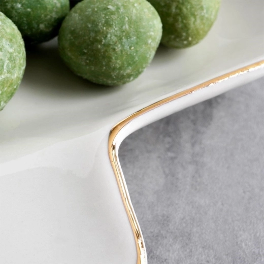 De glanzende witte glazuur en de subtiele gouden omlijning geven het bord een tijdloze en feestelijke uitstraling.