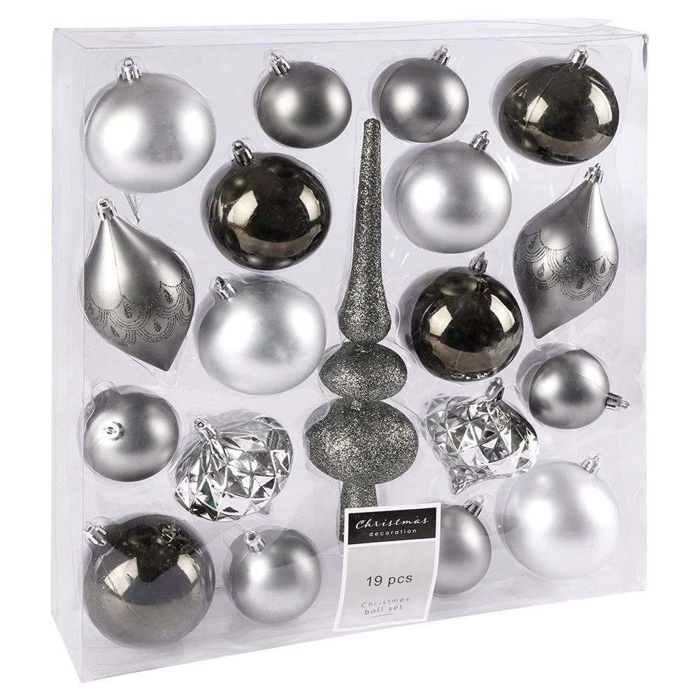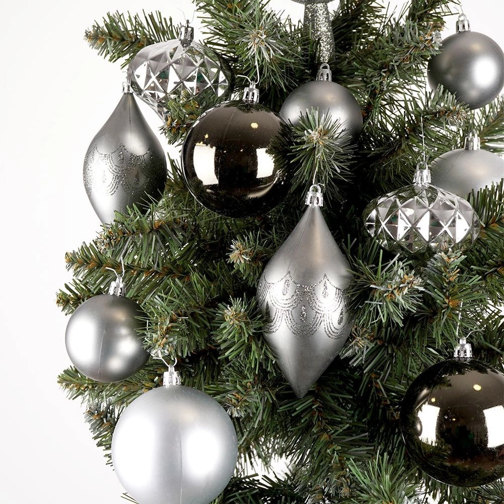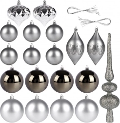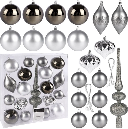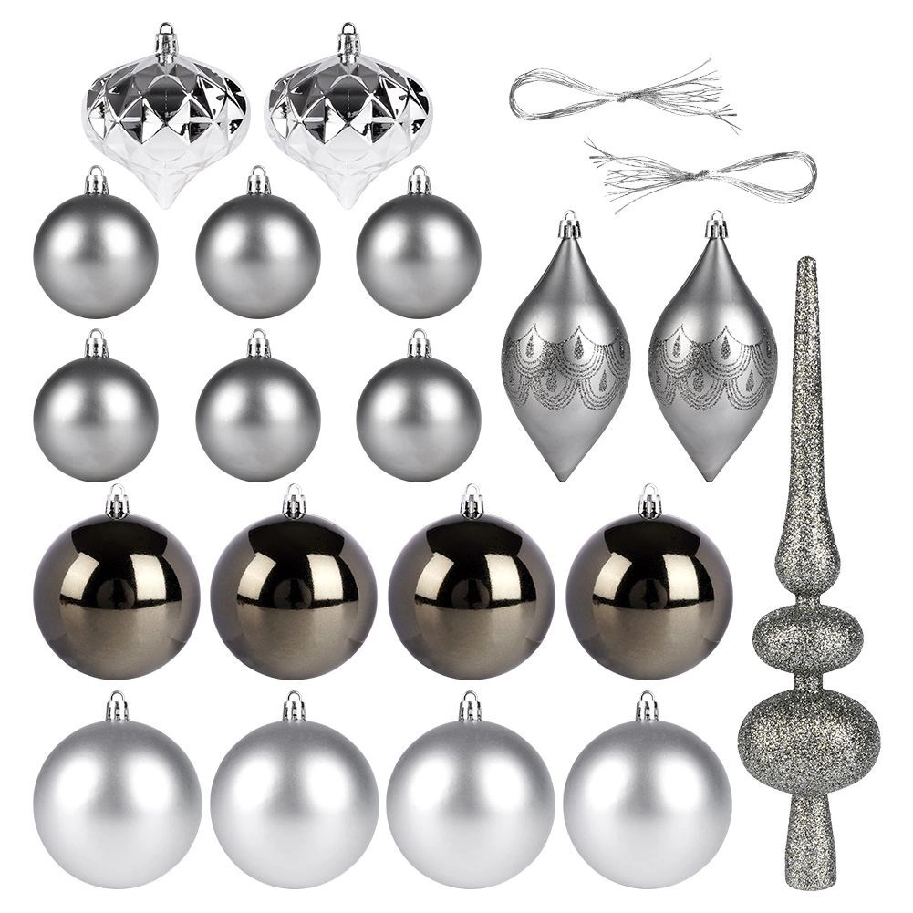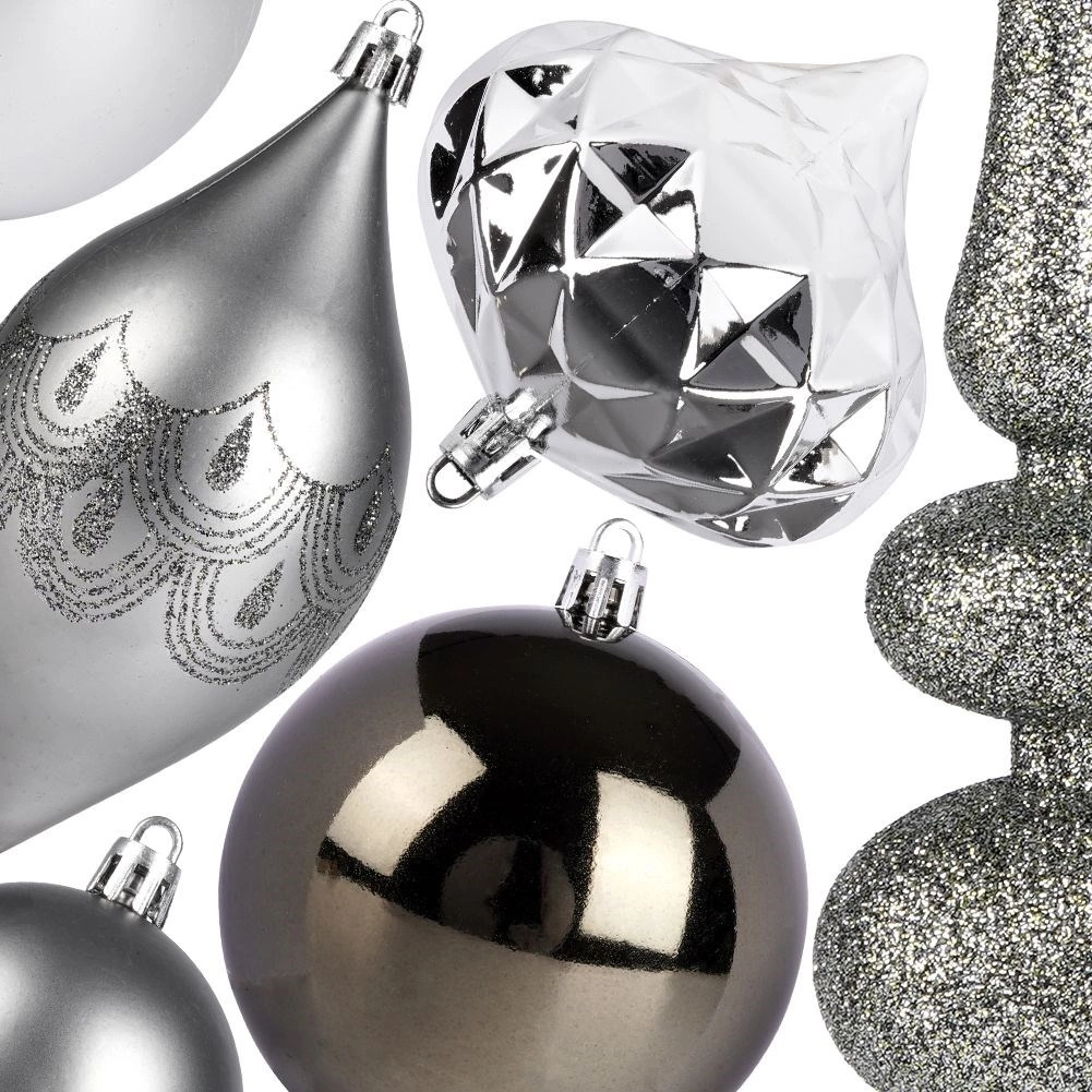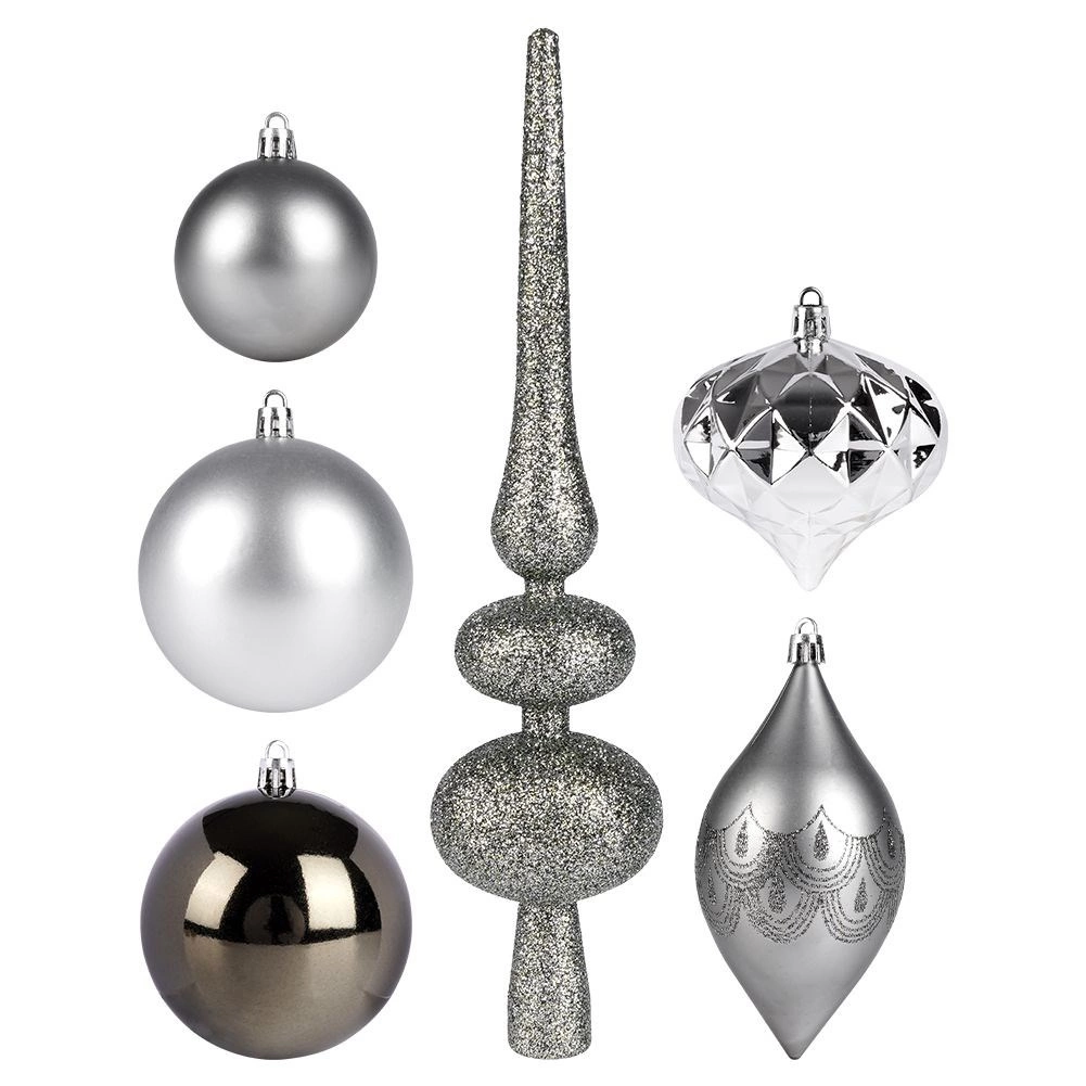 Creëer een harmonieus afgestemde kerstboom met deze complete set ornamenten in moderne zilverkleurige tinten. Diverse vormen en afwerkingen – mat, glans en glitter – geven diepte, sprankeling en elegante contrasten. Inclusief een prominente boomtopper van 30 cm die de decoratie bekroont.