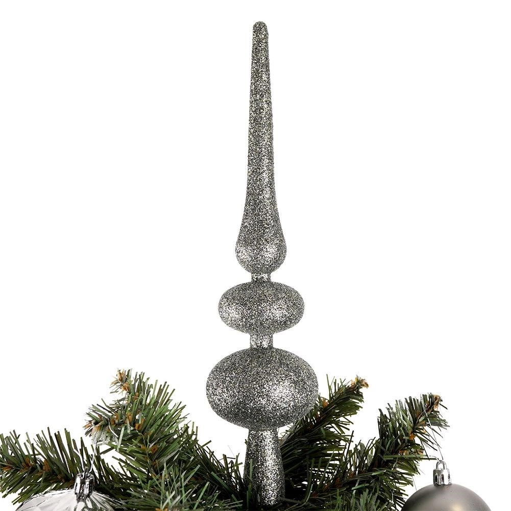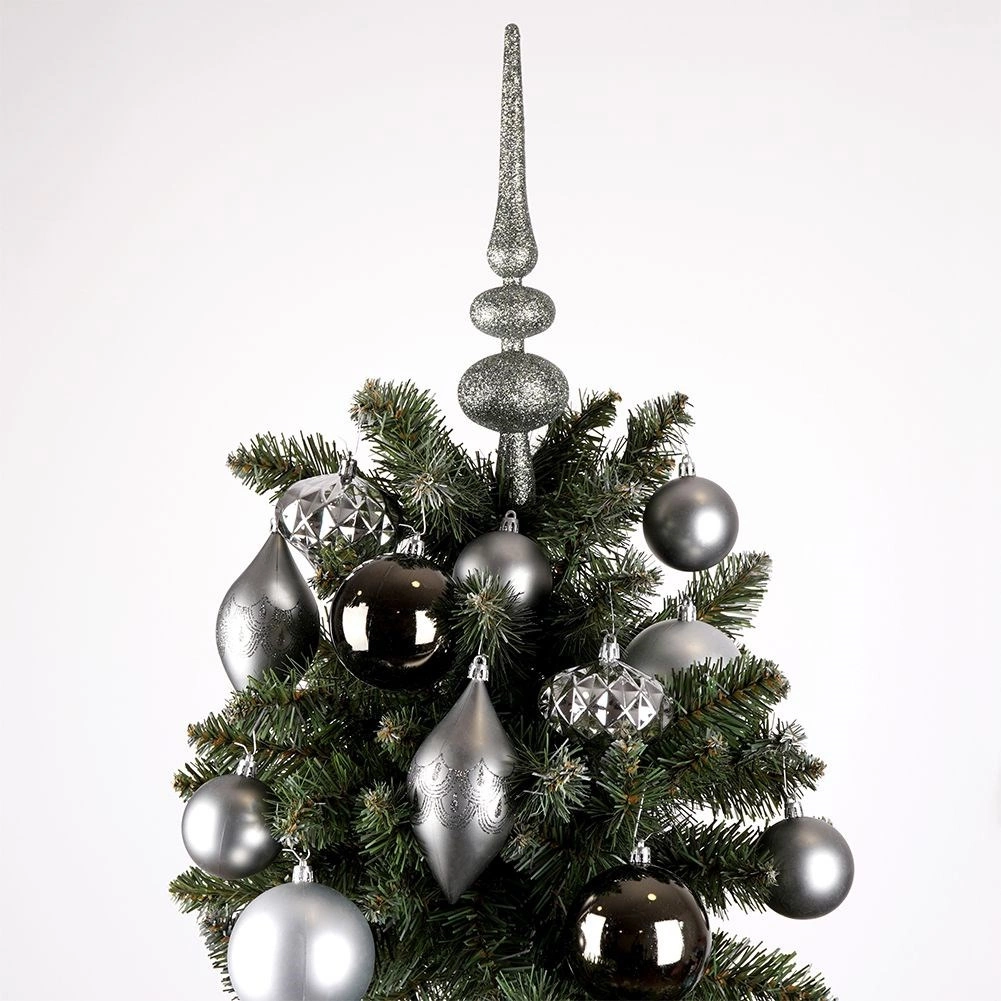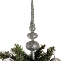 De opvallende zilverkleurige piek met glitter accentueert de top van de boom en geeft de hele decoratie een professionele uitstraling.