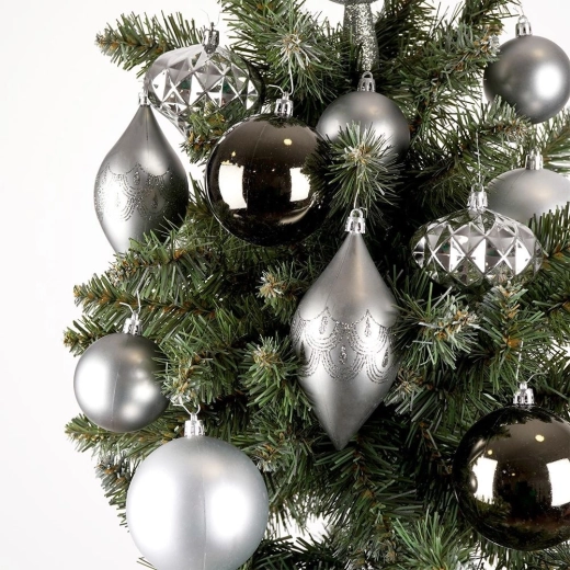 Elegante set met 19 kerstornamenten in zilver- en grafiettinten voor een snel en stijlvol versierde boom. Combineert matte, glanzende en glitterende afwerkingen en bevat ook een glinsterende piek (30 cm). De ornamenten zijn van onbreekbaar hoogwaardig kunststof, veilig voor huishoudens met kinderen en huisdieren, en lijken overtuigend op glas.