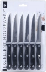 De set bevat 6 stuks messen met een totale lengte van 21 cm (lemmet 11 cm). Het universele ontwerp is ideaal voor steaks, burgers, pizza, vlees en worst. Geschikt voor de thuiskeuken en voor buiten barbecueën. Gemaakt in overeenstemming met Europese kwaliteits- en veiligheidsnormen.