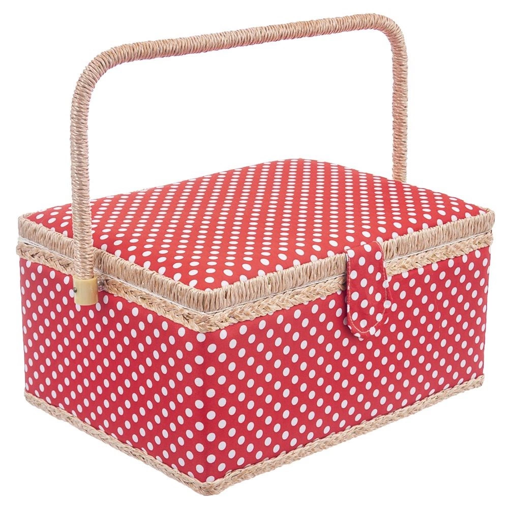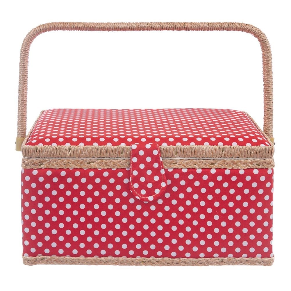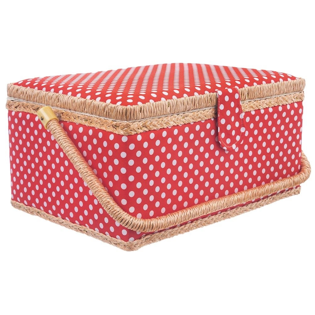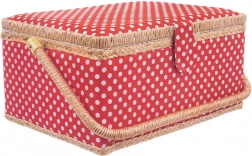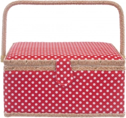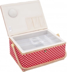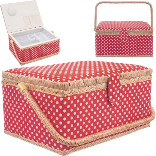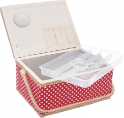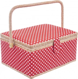 Deze naaikoffer combineert een aantrekkelijk design met een doordachte indeling. De koffer is bekleed met rode stof met witte stippen en voorzien van een stevig handvat voor gemakkelijk dragen. Dankzij de magnetische sluiting sluit je de koffer in één beweging veilig, en blijft de inhoud op zijn plek tijdens het transport.