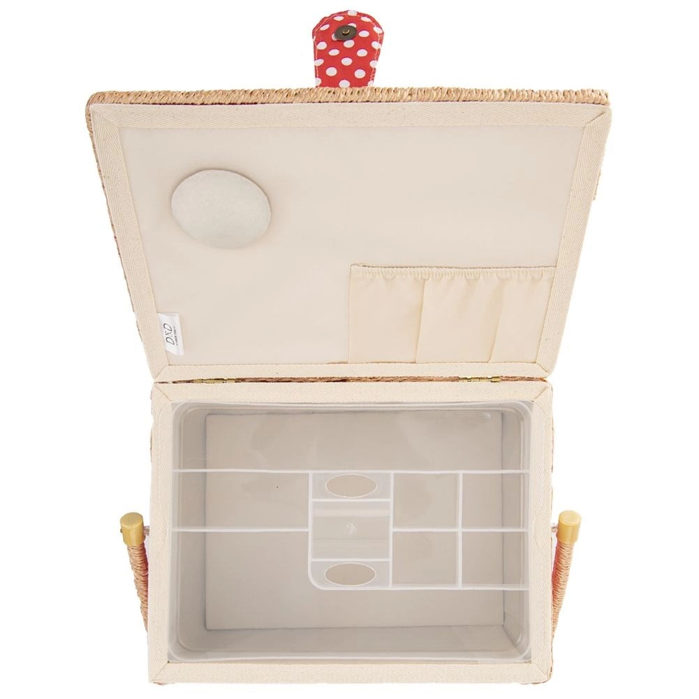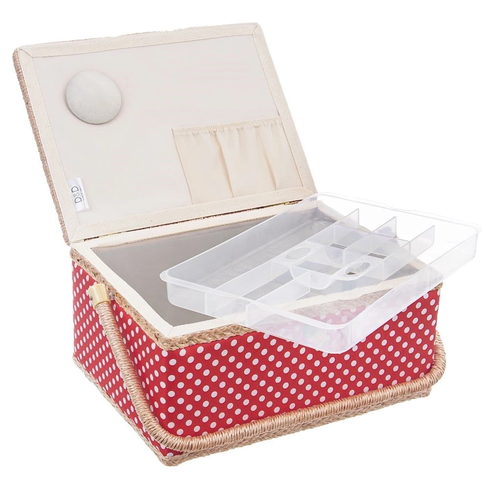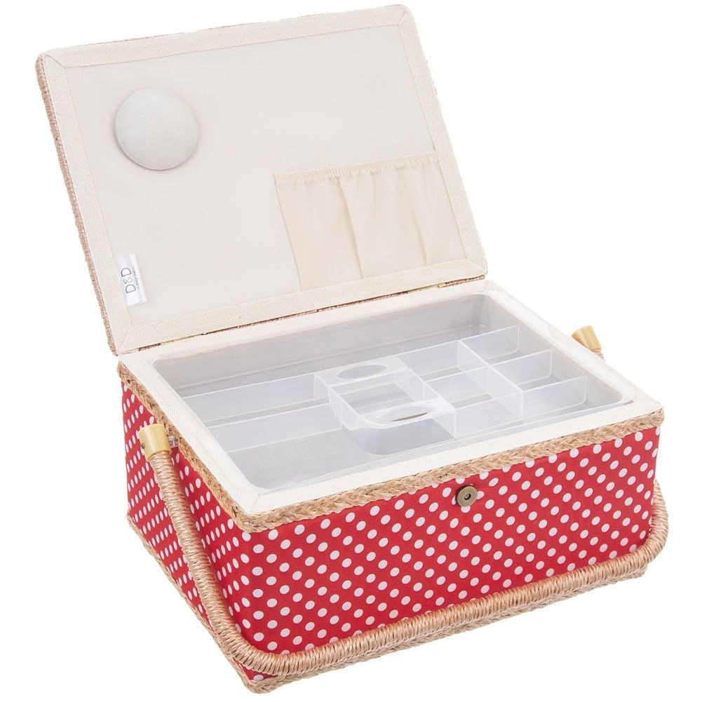 Deze naaikoffer combineert een aantrekkelijk design met een doordachte indeling. De koffer is bekleed met rode stof met witte stippen en voorzien van een stevig handvat voor gemakkelijk dragen. Dankzij de magnetische sluiting sluit je de koffer in één beweging veilig, en blijft de inhoud op zijn plek tijdens het transport.