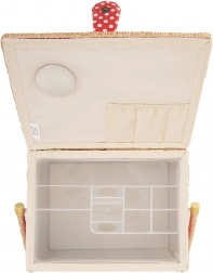 Binnenin vind je een uitneembare kunststof organizer met 4 vakken voor garen, naalden, inrijghulpen of knopen. Na het uitnemen ontstaat een ruim compartiment voor grotere naaibenodigdheden. De binnenzijde van het deksel is uitgerust met een elastisch vak en een naaldkussen, waarin je spelden en naalden gemakkelijk kunt prikken. De koffer is ook uitstekend te gebruiken als organizer voor sieraden.