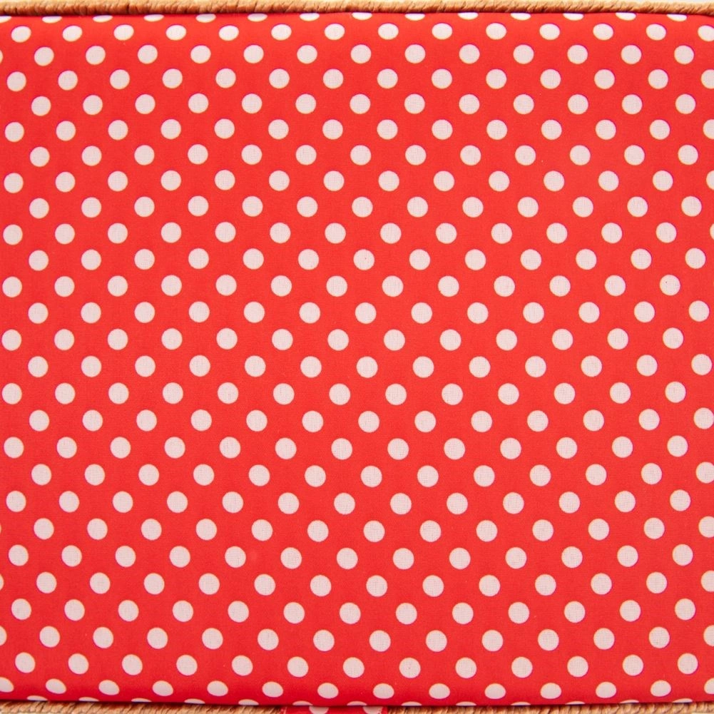 Rode stof met witte stippen en decoratieve vlecht geven je naaiprojecten flair en de koffer past mooi in elke thuiswerkplaats.