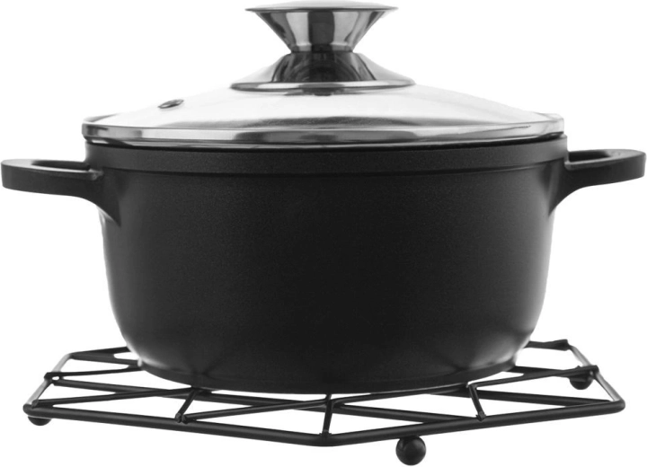 Gemaakt van hoogwaardige metalen in het zwart, is hij stevig en duurzaam voor dagelijks gebruik. Dankzij het universele formaat van 22,5 × 22,5 cm is hij geschikt voor de meeste pannen en koekenpannen. De onderzetter is niet alleen praktisch, maar ook decoratief, zodat je hem gerust op tafel kunt laten staan als stijlvol accessoire.