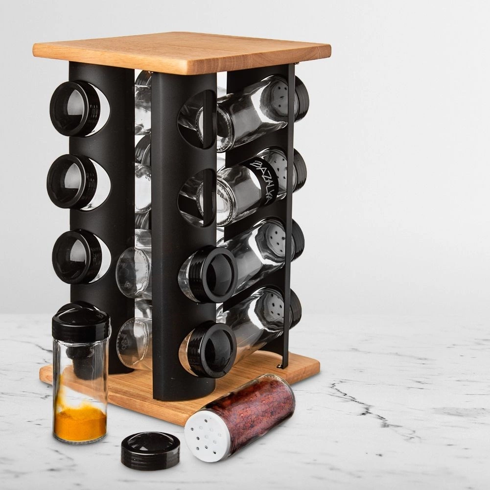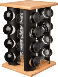 Houd orde in je kruiden en heb alles bij de hand. Het draaibare rek met houten boven- en onderplaat en zwarte metalen constructie biedt plaats aan 16 kruidenpotjes. Elk potje heeft een zwart schroefdeksel en een wit zeefje voor comfortabel en gelijkmatig strooien. Het transparante glas maakt snelle controle van inhoud en hoeveelheid mogelijk.