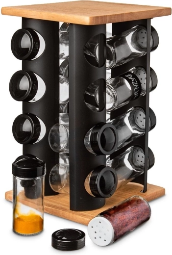 Elegant draaibaar kruidenrek met 16 glazen kruidenpotjes houdt je keuken overzichtelijk en stijlvol. De combinatie van zwart metaal en hout is stevig en duurzaam, de potjes van 80 ml hebben schroefdeksels en strooizeefjes voor eenvoudig doseren. Dankzij de draaibare constructie vind je snel het gewenste kruid en de transparante glazen wanden bieden direct zicht op de inhoud. Glazen onderdelen zijn vaatwasmachinebestendig. Merk ORION.