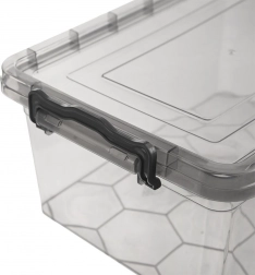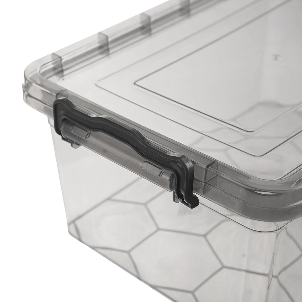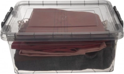 Universele kunststof box met een inhoud van 14 l en een veilig deksel met clips, ideaal voor het opbergen van etenswaren, kleding en kleine voorwerpen. Dankzij het transparante donkergrijze ontwerp zie je de inhoud zonder te openen. Het materiaal is BPA-vrij, bestand tegen temperaturen van -25 °C tot +95 °C, geschikt voor de vaatwasser, magnetron (zonder deksel), koelkast en vriezer. Het afsluitbare deksel met twee clips beschermt de inhoud tegen vocht en stof en maakt veilig transport mogelijk.