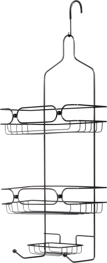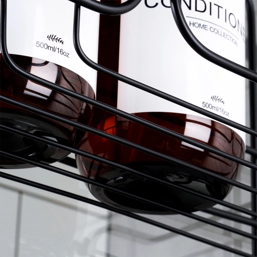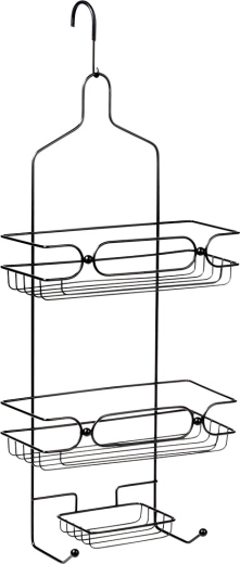 Het hoogwaardige zwart gelakte metaal is stevig en corrosiebestendig, zodat het rek dagelijks gebruik moeiteloos doorstaat. De rubbercoating op de ophanghaak beschermt glas en voorkomt wegglijden. Twee grote planken bieden ruimte aan shampoos en gels; het onderste zeepbakje en het duo haakjes zijn ideaal voor sponsen, scheermesjes of borstels.