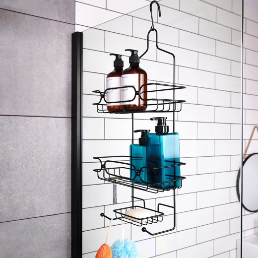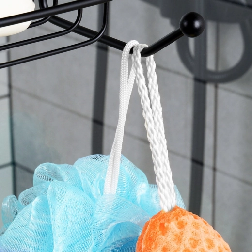Praktisch hangend doucherek in elegante zwarte kleur houdt je badkamer overzichtelijk en stijlvol. Biedt montage zonder boren, een duurzame metalen constructie met antiroestafwerking en een met rubber beklede haak voor veilig ophangen zonder krassen op glas. Twee ruime planken, een zeepschaaltje en haakjes voor accessoires houden alles binnen handbereik.