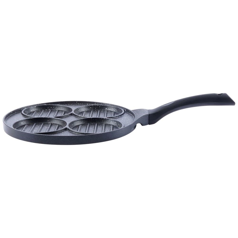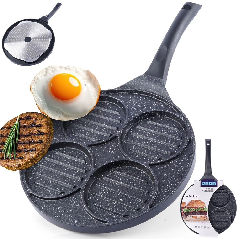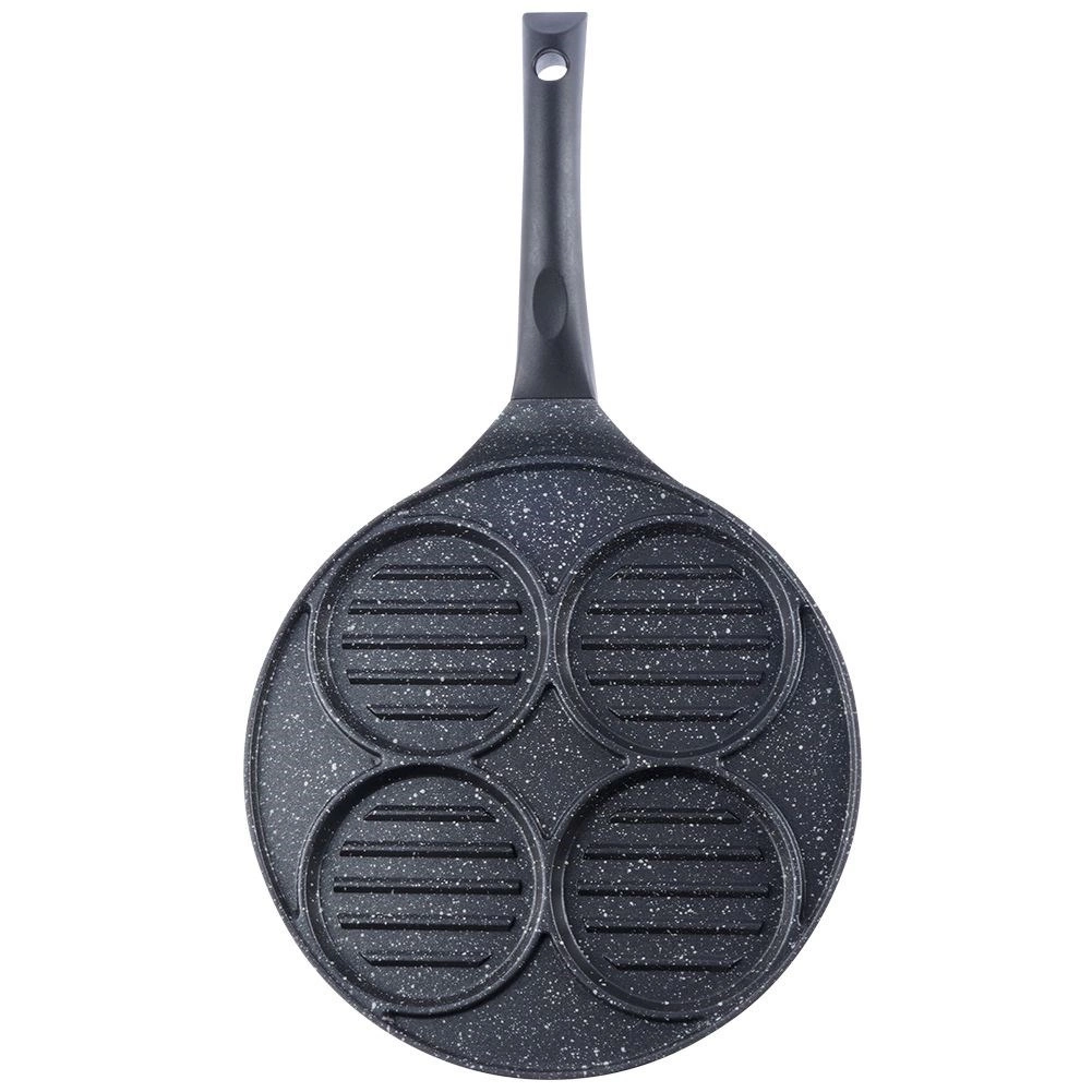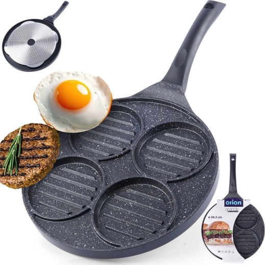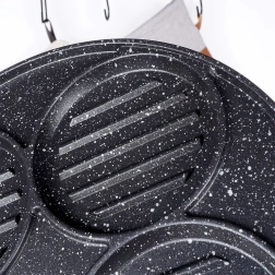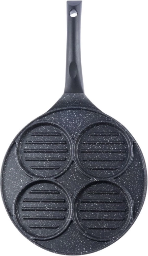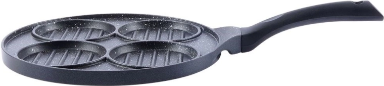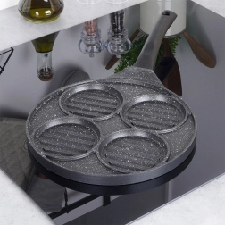 Deze multifunctionele pan met een diameter van 26,5 cm en vier gescheiden ronde secties (elk ca. 10 cm) laat u burgers, spiegeleieren, pannenkoekjes of groenteburgers gelijktijdig bereiden zonder smaakvermenging. De granieten antiaanbaklaag PFLUON GRANIT zorgt voor minimale aanbak, minder olieverbruik en eenvoudige reiniging.