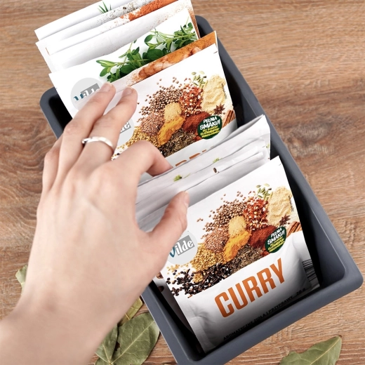 Twee binnenste tussenschotten creëren drie secties waarin je kruiden, specerijen en andere zakjes eenvoudig sorteert en altijd snel vindt wat je nodig hebt.