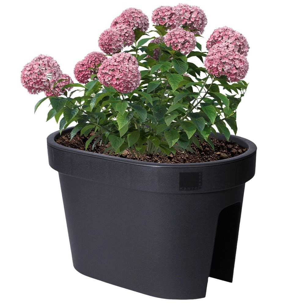 De hangbloembak met centrale uitsparing voor een veilige plaatsing op de balustrade maakt het mogelijk om zelfs op kleine oppervlakken te tuinieren. De moderne zwarte uitvoering komt prachtig tot zijn recht op balkon, terras en in de tuin en geeft de beplanting een strakke, elegante uitstraling.