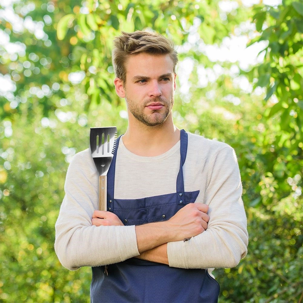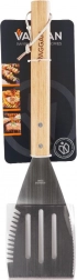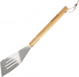 De VAGGAN-spatel combineert duurzaam roestvrij staal met een ergonomisch houten handvat voor een zekere grip bij een hete grill. De kop met sleuven vergemakkelijkt de afvoer van overtollig vet, terwijl de getande randen en geslepen zijde burgers, groenten en worst direct op het rooster kunnen snijden.