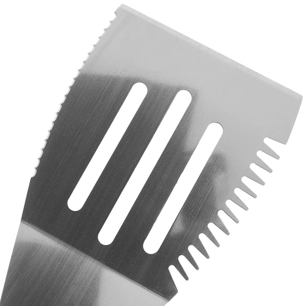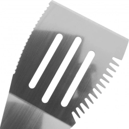 De gekartelde zijkanten en de scherpe rand maken het mogelijk om direct tijdens het grillen te snijden of porties af te steken – zonder extra gereedschap.