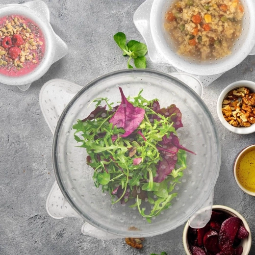 De deksels vervangen wegwerpvershoudfolie en aluminiumfolie – ze zijn milieuvriendelijk, herbruikbaar en gemakkelijk schoon te maken. Geschikt voor glas, keramiek, porselein en roestvrij staal. Naast het afdekken kunnen ze ook dienen als antislip onderleggers onder kommen, borden of glazen. Opgerold nemen ze minimaal ruimte in.