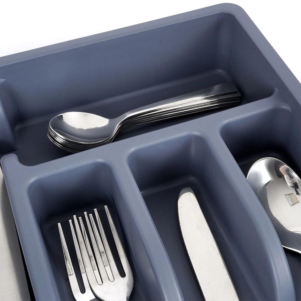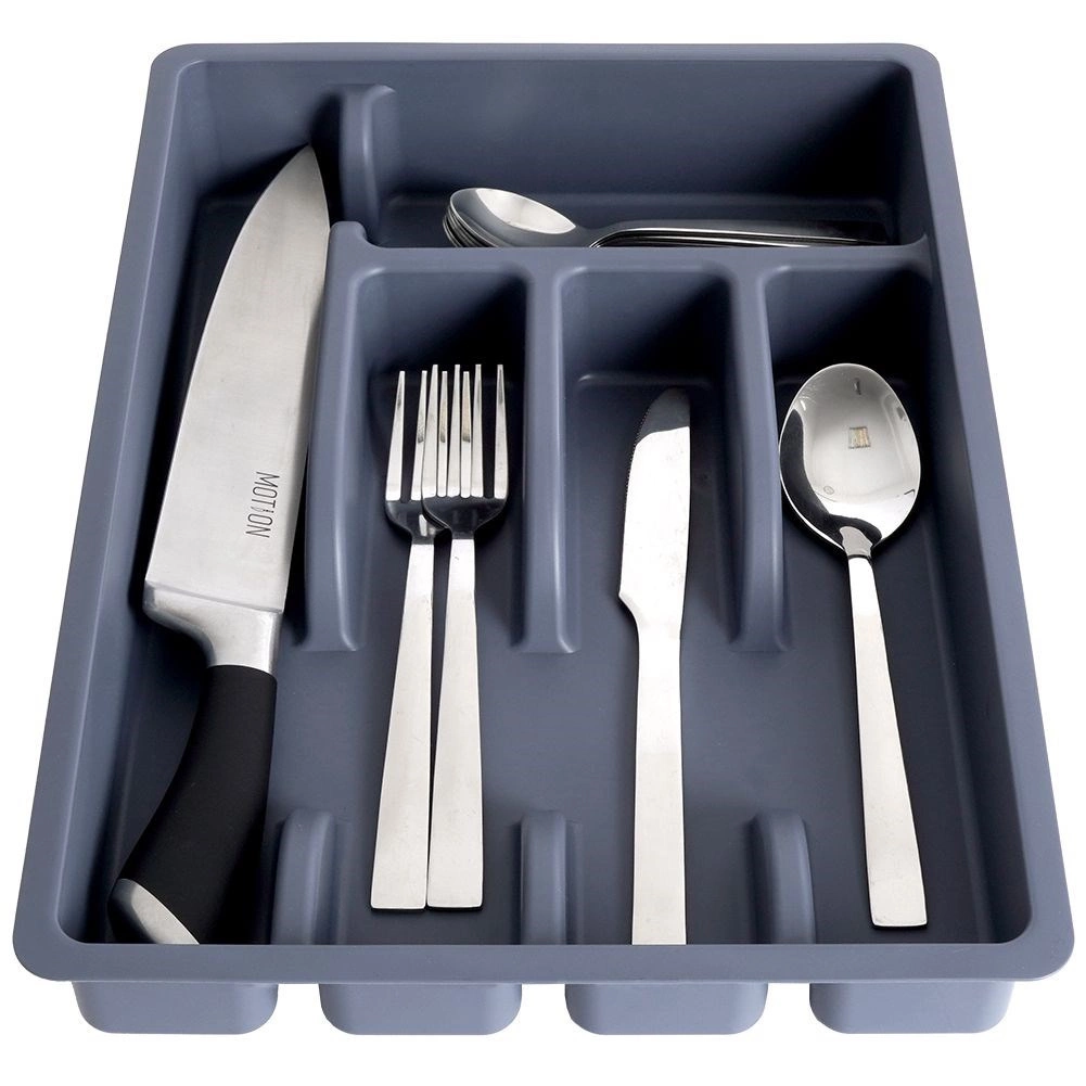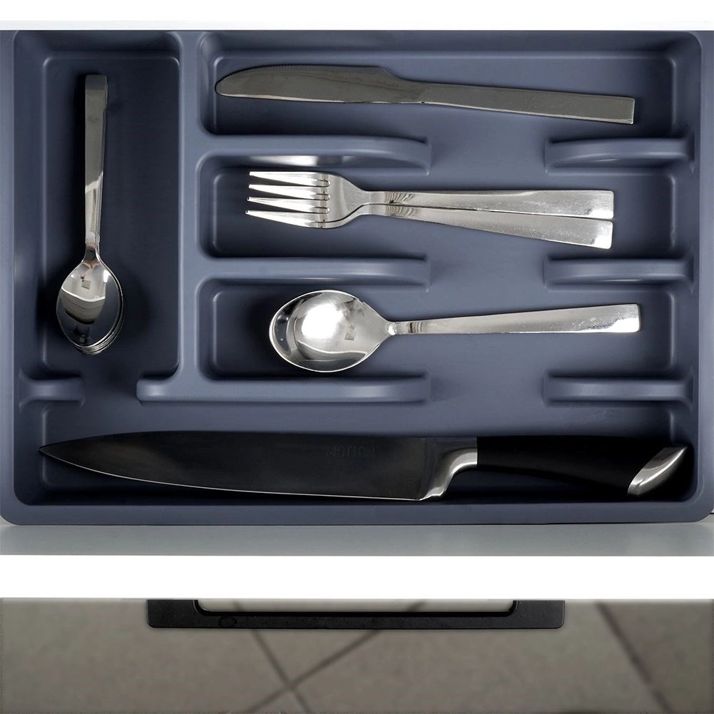 De organizer is gemaakt van hoogwaardige, duurzame kunststof in modern grijs, waardoor hij gemakkelijk te onderhouden is en lang meegaat. De interne tussenschotten voorkomen dat bestek verschuift bij het openen van de lade, wat het dagelijks gebruik comfortabeler maakt.