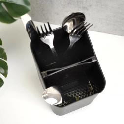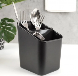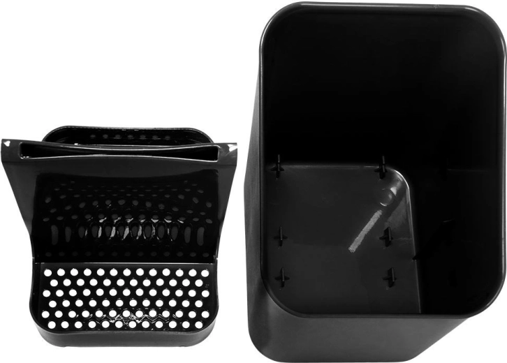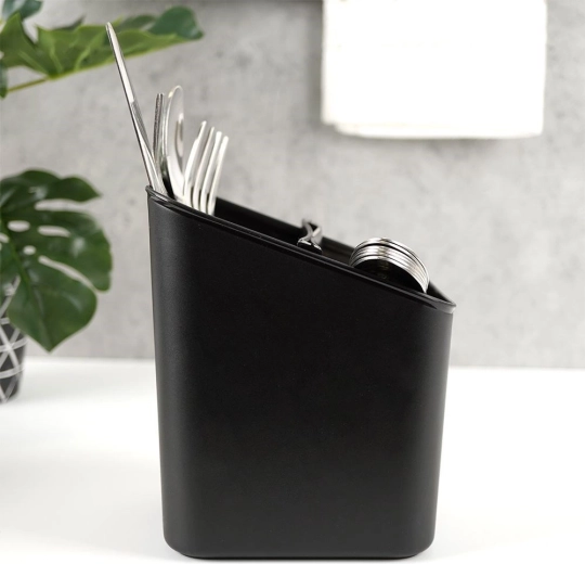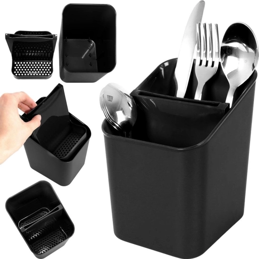 Deze elegante en functionele bestekafdruiper in tijdloos zwart houdt je keuken georganiseerd en schoon. Dankzij de uitneembare separator deel je bestek eenvoudig in, en na het verwijderen krijg je een ruime houder met één compartiment. De geperforeerde bodem zorgt voor snelle waterafvoer, zodat bestek niet in vocht staat en het werkblad droog blijft.