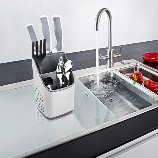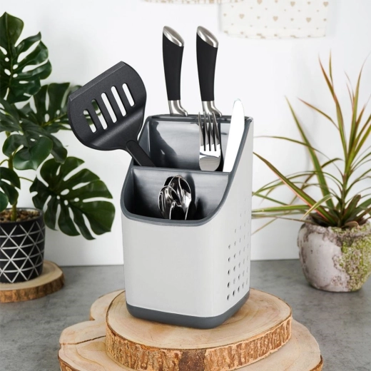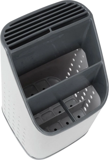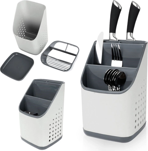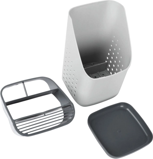 Praktisch grijs afdruiprek en organizer houdt je bestek, messen en keukengerei altijd binnen handbereik en overzichtelijk gescheiden. Dankzij de meerkamerindeling, de uitneembare afdruipschaal en ventilatieperforaties drogen je spullen snel, staan ze niet in water en blijft het aanrecht schoon. Licht en duurzaam kunststof in lichtgrijs met grafiet past in elke moderne keuken.
