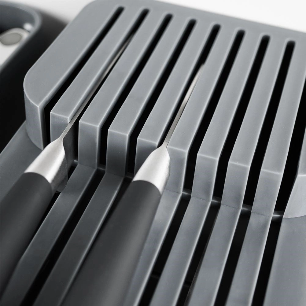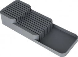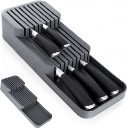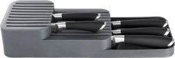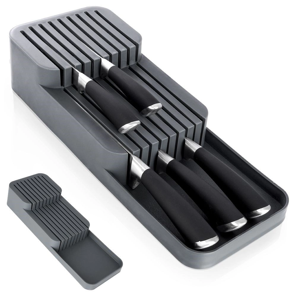 Deze praktische messenorganizer van duurzaam kunststof houdt je keukengerei overzichtelijk en veilig. Dankzij de doordachte constructie worden messen op twee niveaus opgeborgen, waardoor ze minimale ruimte innemen en toch gemakkelijk bereikbaar blijven. De grijze kleur en het strakke design passen perfect in elke moderne keuken.