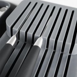 De organizer biedt plaats aan tot 18 messen van verschillende lengtes – van kleine mesjes tot langere koks messen. Elk mes heeft een eigen geleiding die de lemmeten tegen bot worden beschermt en veilig uitnemen mogelijk maakt. Het materiaal is gemakkelijk te onderhouden: simpelweg afnemen of afspoelen.