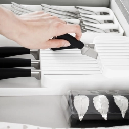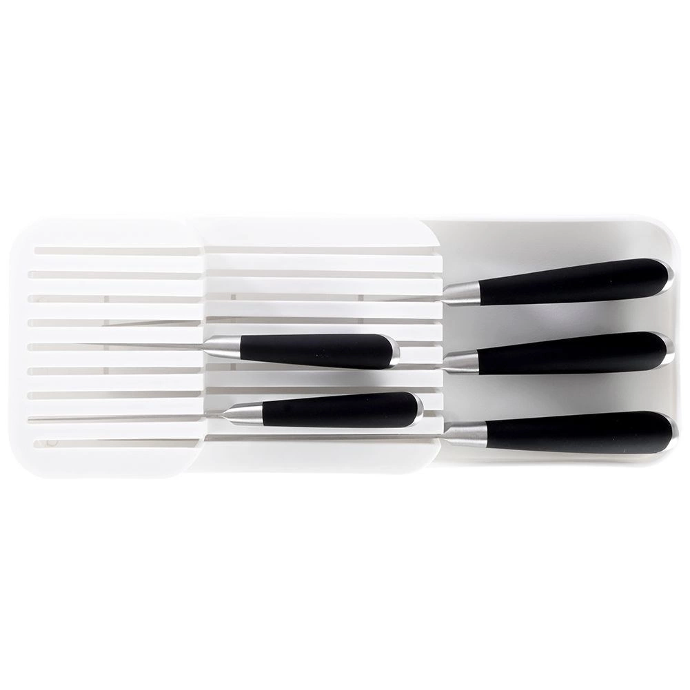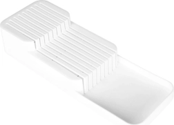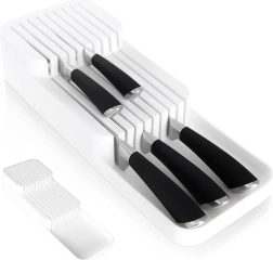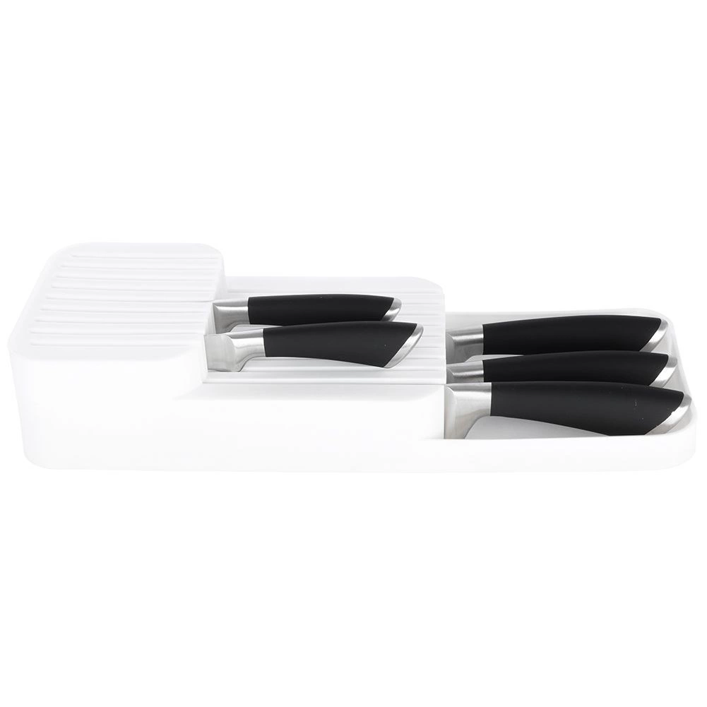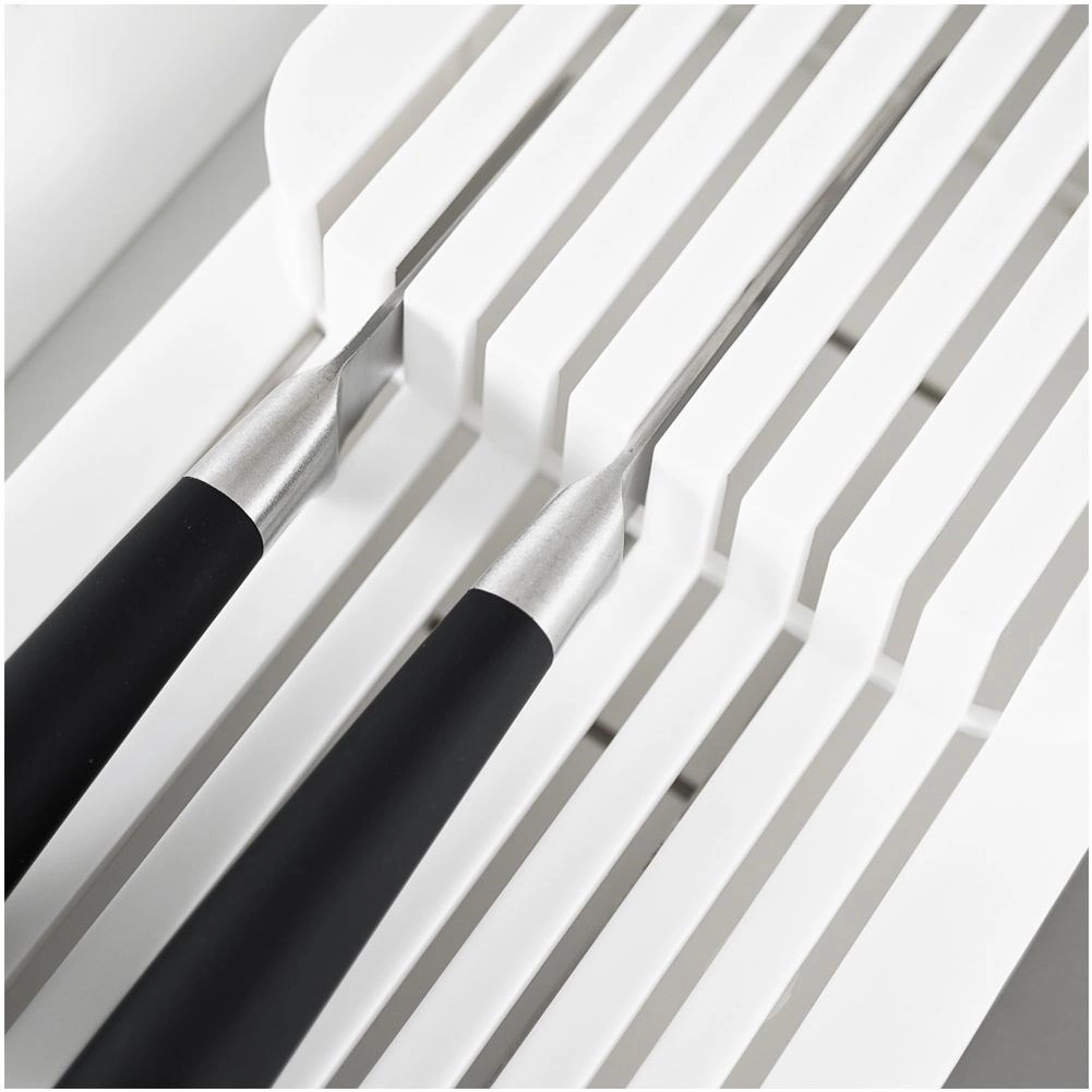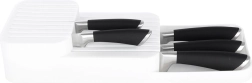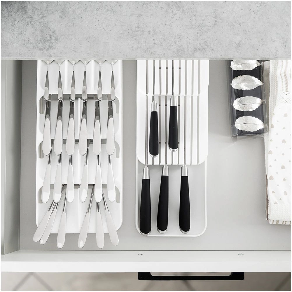 De praktische en ruimtebesparende messenorganizer helpt je messen overzichtelijk en veilig op te bergen. De dubbele, getrapte constructie bespaart ruimte in de lade, terwijl de gevormde groeven elk mes op zijn plaats houden. Het minimalistische witte design past in elke moderne keuken.