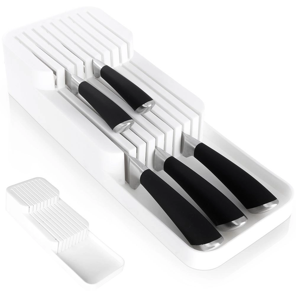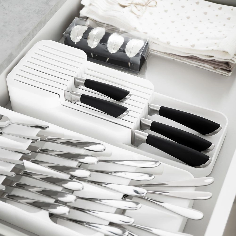 Houd je keuken perfect opgeruimd met deze witte lade-organizer voor messen met afmetingen 39 × 14,5 × 7,5 cm. Biedt tot 18 sleuven voor korte en lange messen, dubbel-laags opberging voor ruimtebesparing en een duurzame uitvoering van hoogwaardig kunststof. Hij is compact, veilig en past dankzij de universele afmetingen in de meeste keukenlades.