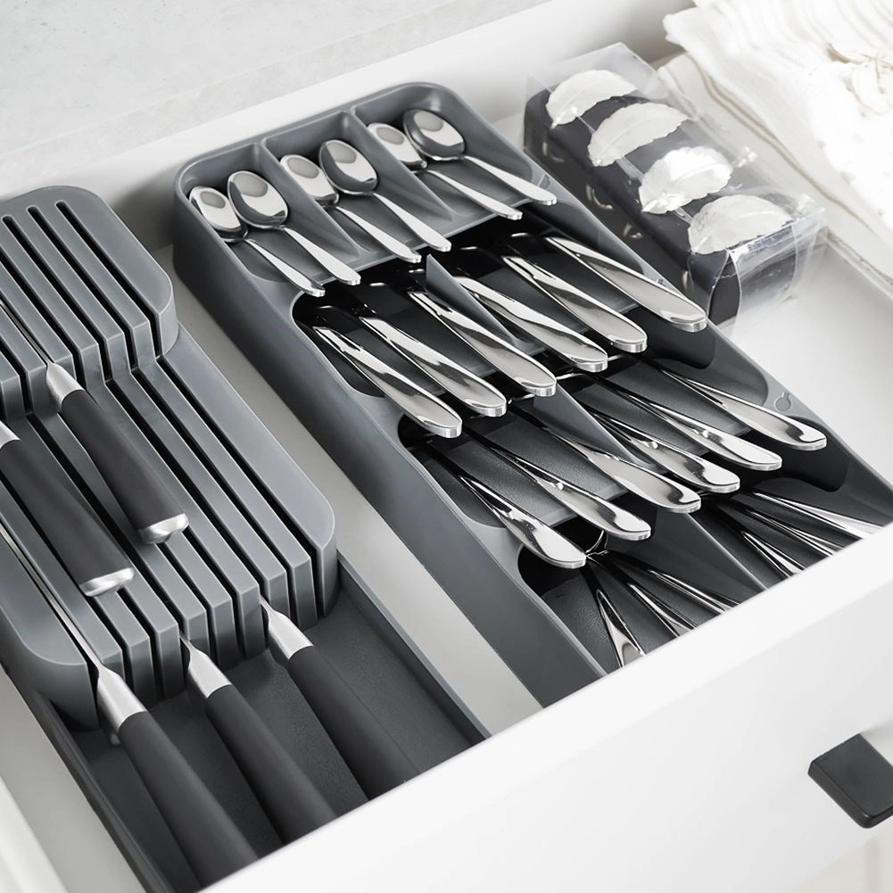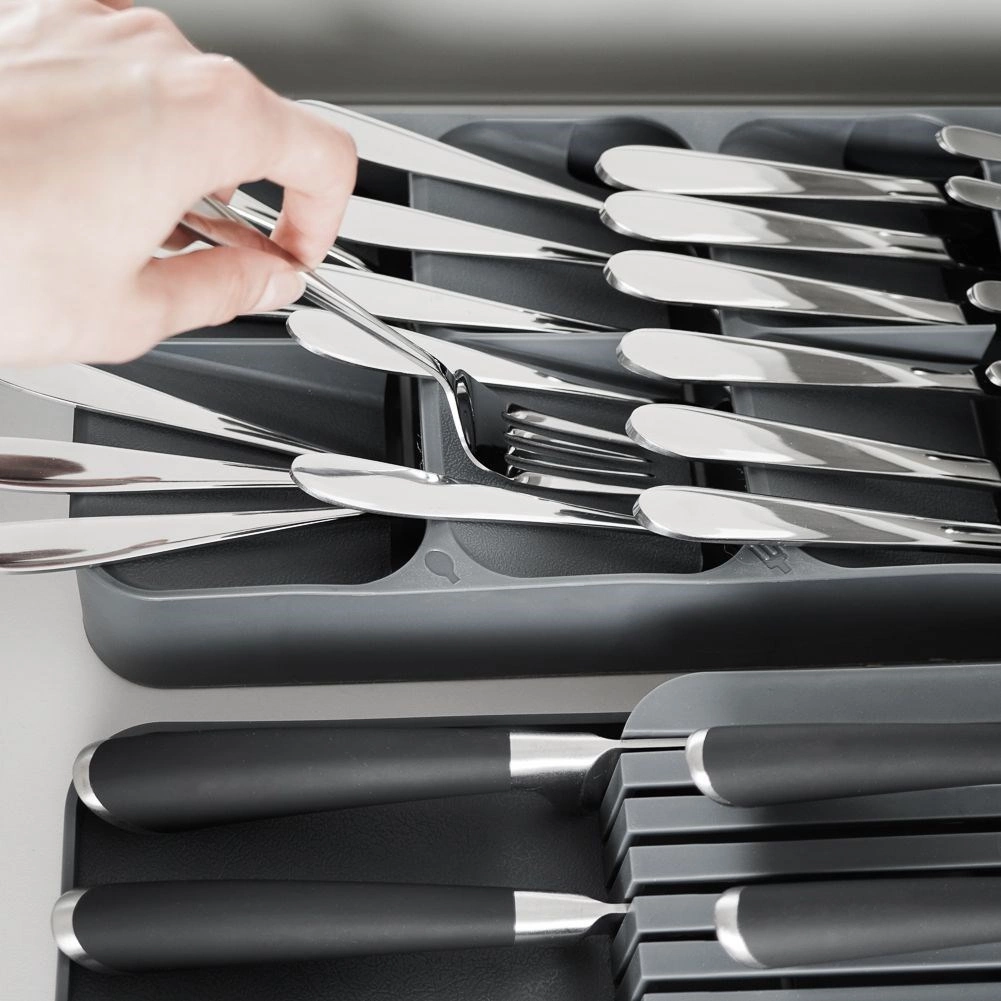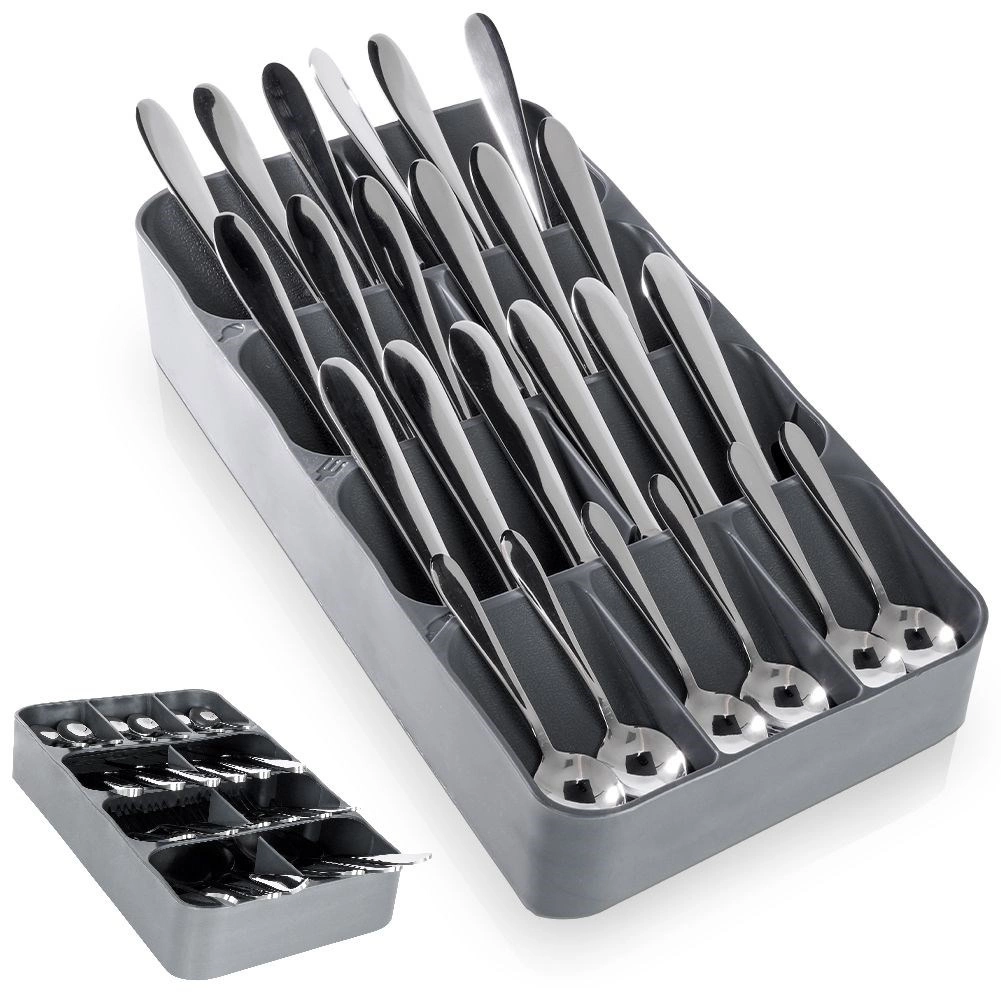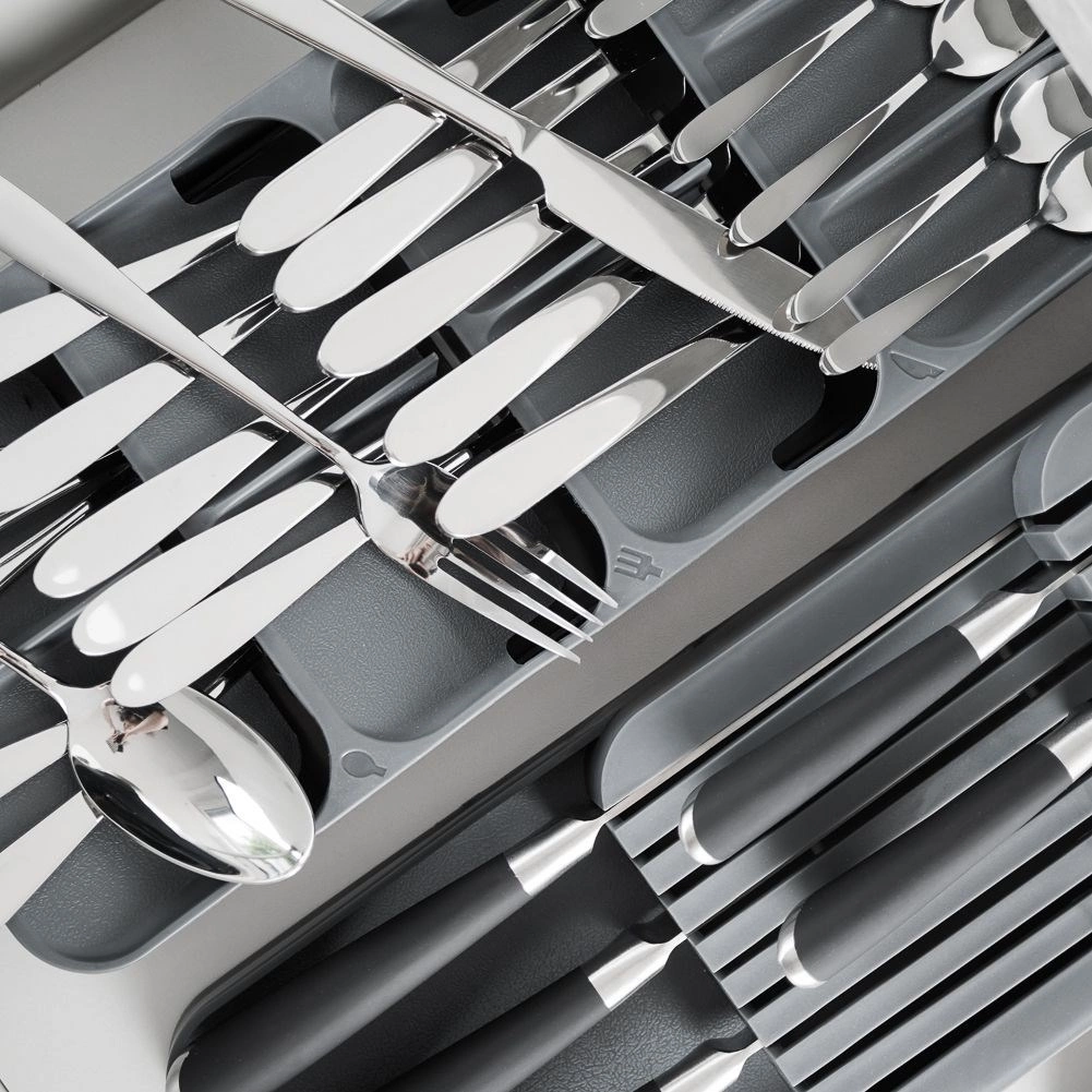 Negen doordacht ingedeelde vakken en een meerlagige opzet houden al het bestek op zijn plek en direct binnen handbereik.