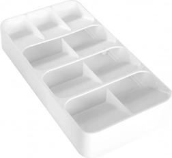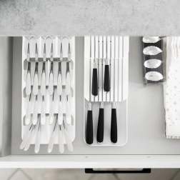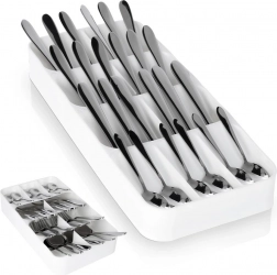 Houd je bestek overzichtelijk en binnen handbereik. Deze compacte lade-organizer combineert slanke afmetingen van 39 × 17 × 5,5 cm met een hoge capaciteit. Dankzij 9 vakken scheid je lepels, vorken, messen en kleine koffie-lepeltjes en -vorkjes moeiteloos. Het klassieke witte design past in elke keuken en in de meeste lades.