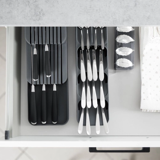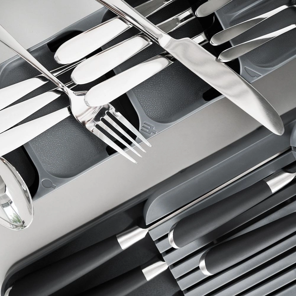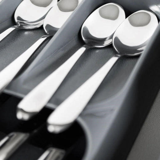 De duurzame uitvoering van hoogwaardig kunststof in elegant grijs zorgt voor eenvoudig schoonmaken en een lange levensduur. Ideaal voor het opbergen van lepels, vorken, messen en kleine lepels en vorken, waarbij elk stuk zijn eigen plek heeft.