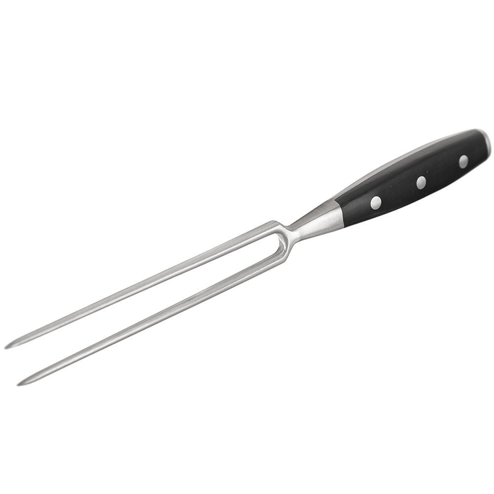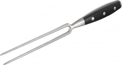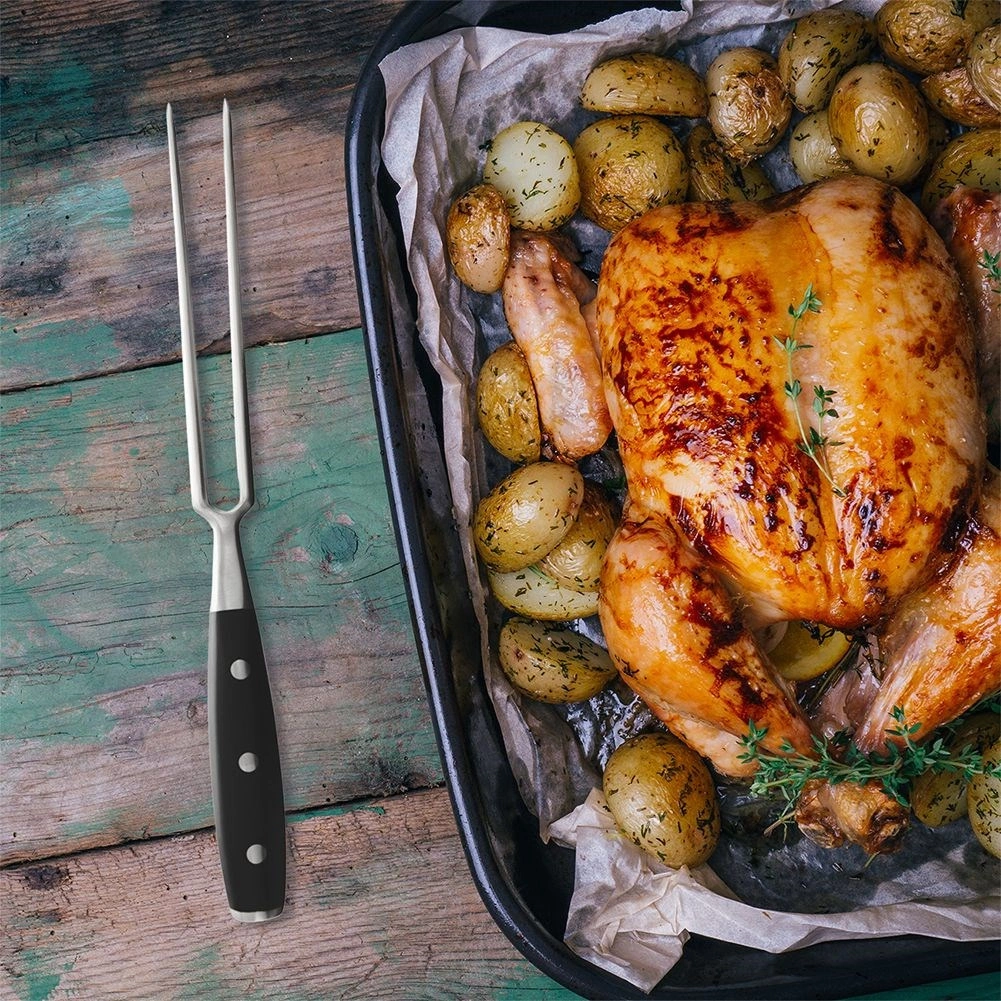 De robuuste vleesvork van roestvrij staal biedt precieze controle bij het snijden van braadstukken, steaks en gevogelte. Lange, scherpe punten houden stukken vlees veilig vast en maken comfortabel portioneren en serveren mogelijk. Het ergonomische handvat van duurzaam zwart ABS glijdt niet in de hand en dankzij de 3-punts klinknageling is maximale stabiliteit gewaarborgd.