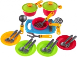 Deze kleurrijke servies set met snijplank is perfect voor kinderkeukens en rollenspellen rond koken. Licht maar stevig plastic zorgt voor veilig en langdurig gebruik, terwijl de afzonderlijke onderdelen prettig in kleine handjes liggen.