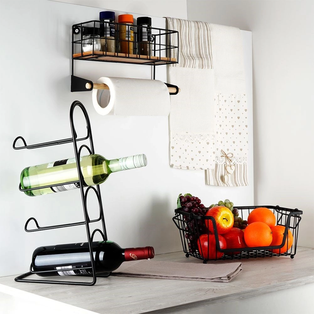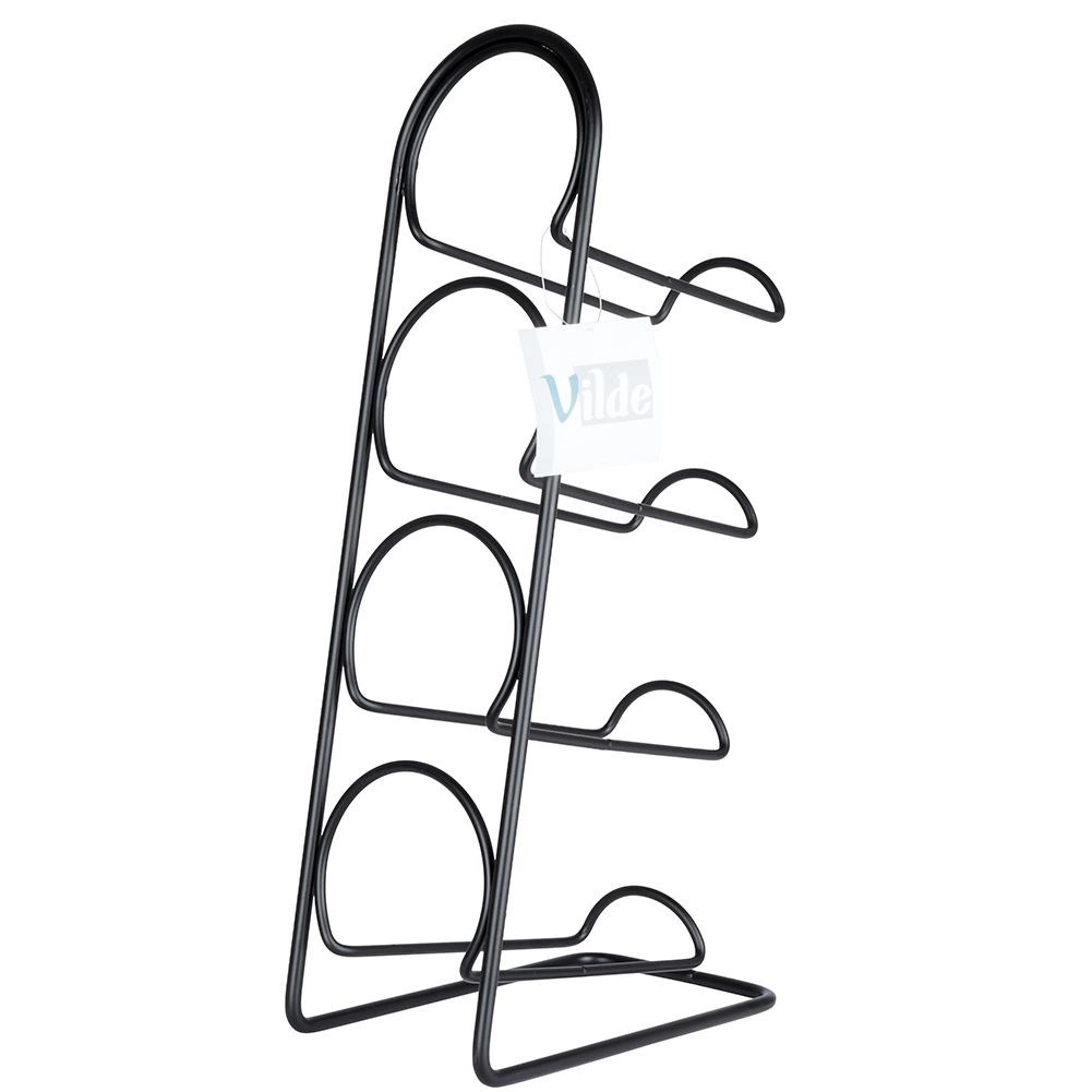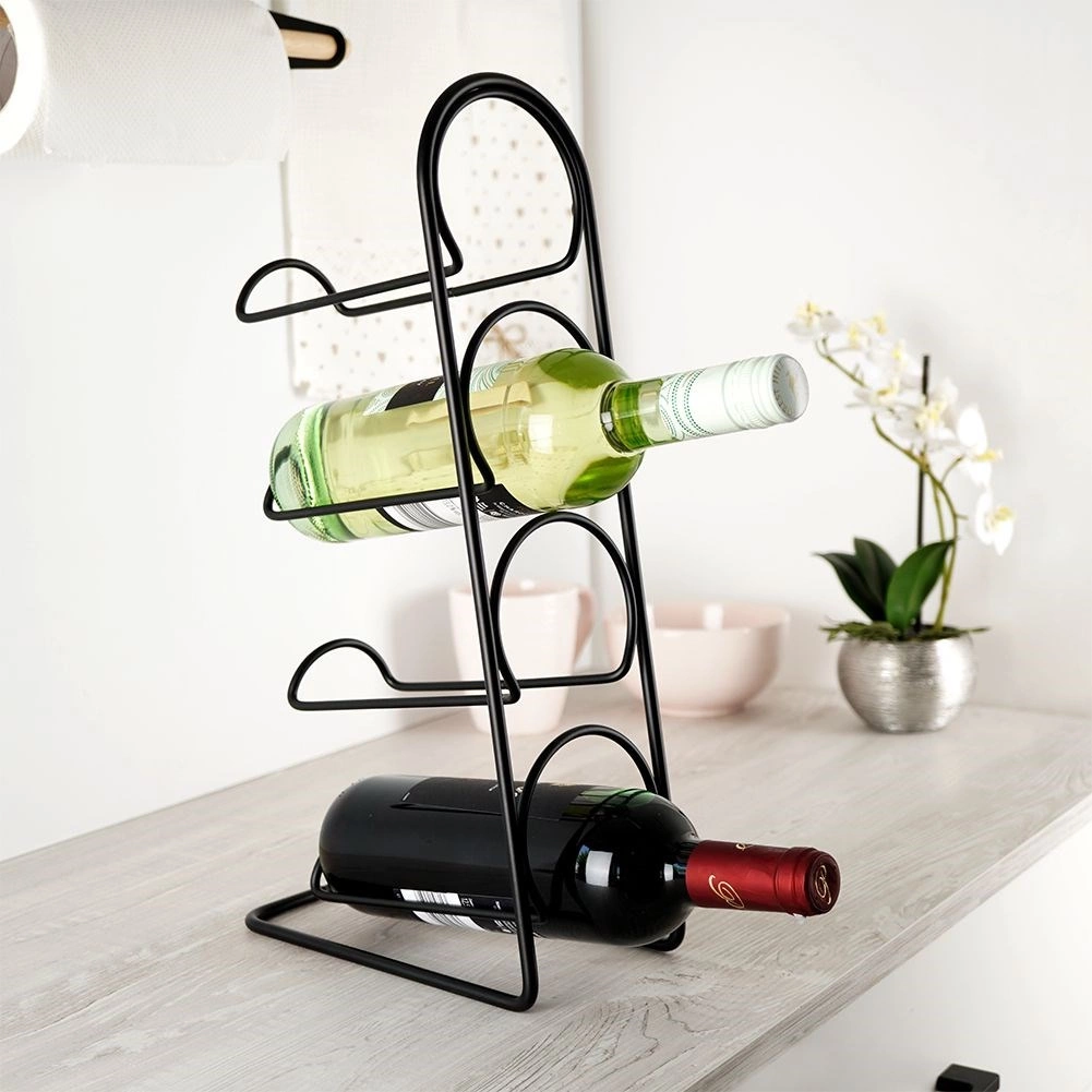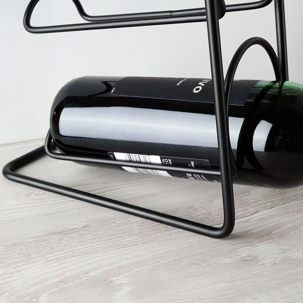 Praktisch en opvallend wijnrek met een minimalistisch draadontwerp, geschikt voor maximaal vier flessen wijn of andere dranken. De stevige metalen constructie in matzwart is duurzaam, stabiel en gemakkelijk te onderhouden. Dankzij de horizontale plaatsing liggen de flessen correct en blijft de kurk vochtig.
