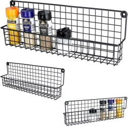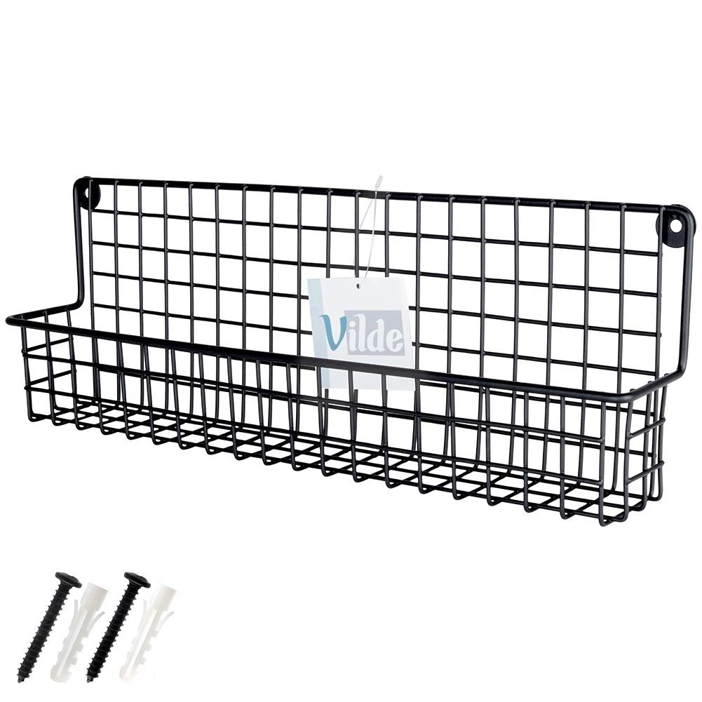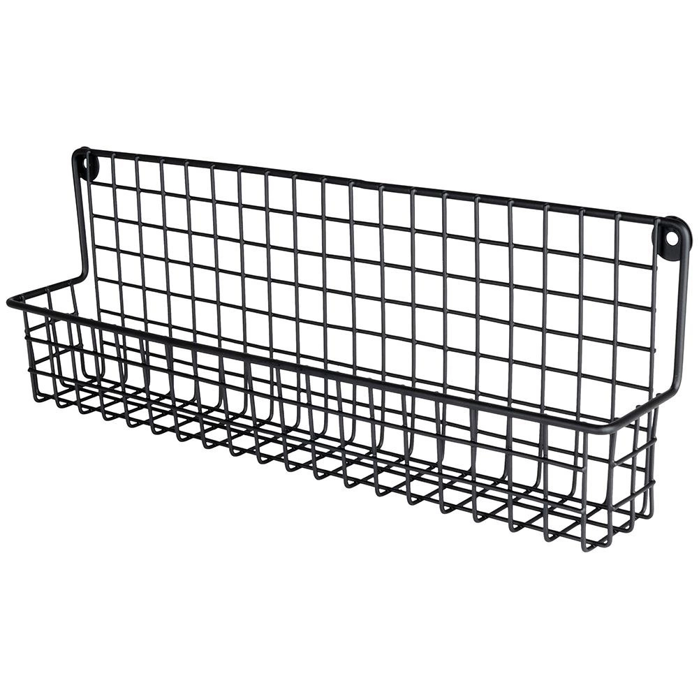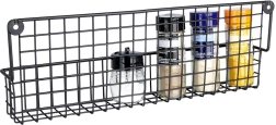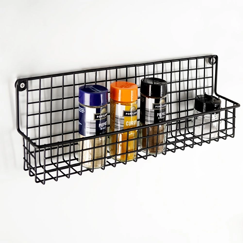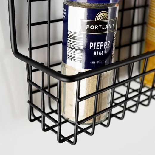 Duurzaam zwart metaal met draadmand houdt kruidenpotjes en kleine flesjes veilig op hun plaats en maakt overzichtelijke opslag eenvoudig.