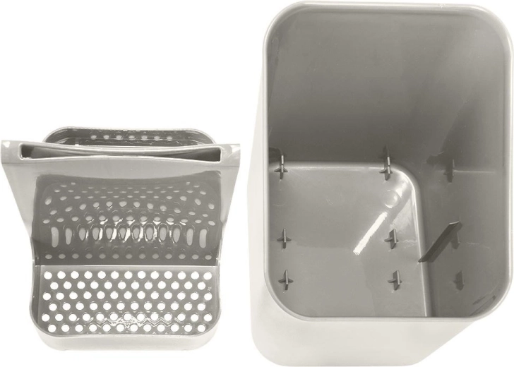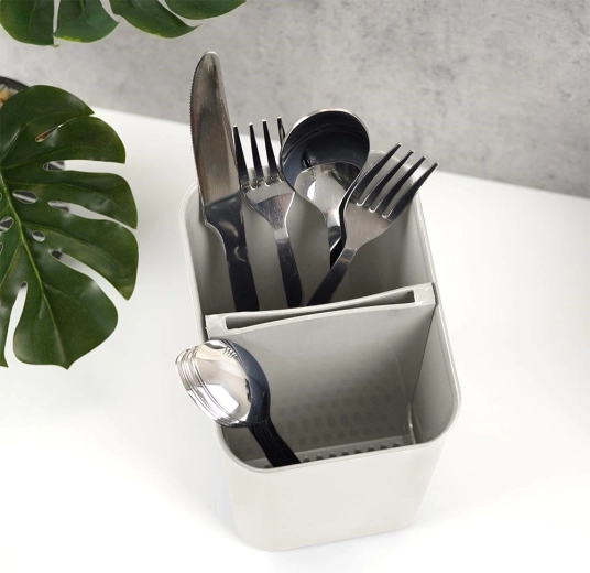 Praktische afdruiprek en bestekhouder in grijs zorgt ervoor dat je vorken, lepels en messen altijd overzichtelijk opgeborgen en snel droog zijn. Dankzij de uitneembare scheidingswand met twee vakken en de geperforeerde bodem is reinigen eenvoudig en kan water veilig weglopen, zodat het aanrecht schoon blijft. Het product is licht, duurzaam, universeel en heeft een klassiek ontwerp dat in elke keuken past.