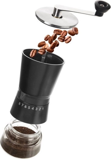 Compacte handmatige koffiemolen met een hoogte van 21 cm, voorzien van een 8‑voudige maalgraad-instelling, een keramisch maalmechanisme en een glazen opvangpot voor gemalen koffie. Duurzame uitvoering van roestvrij staal met antislipafwerking en een comfortabele slinger voor nauwkeurig handmalen zorgt voor versgemalen koffie voor espresso en filtermethoden.
