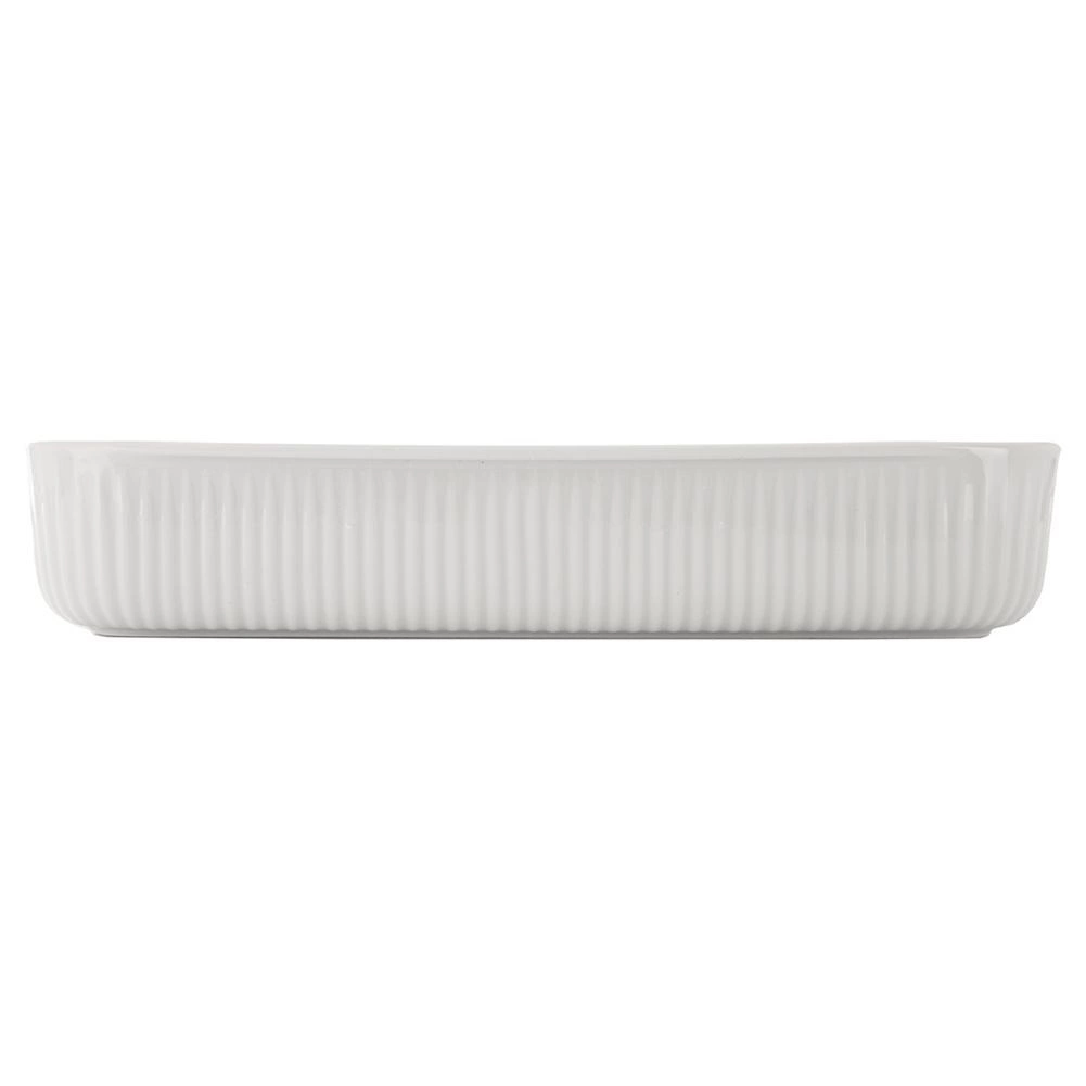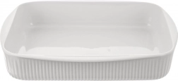 De schaal is multifunctioneel: je kunt erin bakken in de oven, opwarmen in de magnetron, gerechten in de koelkast bewaren en haar na gebruik zonder zorgen in de vaatwasser plaatsen. Praktische geïntegreerde grepen zorgen voor veilige hantering; gebruik ovenhandschoenen bij het uitnemen van de hete schaal uit de oven. Het tijdloze witte design met geribde structuur past op elke tafel en is ideaal om in te serveren.
