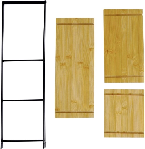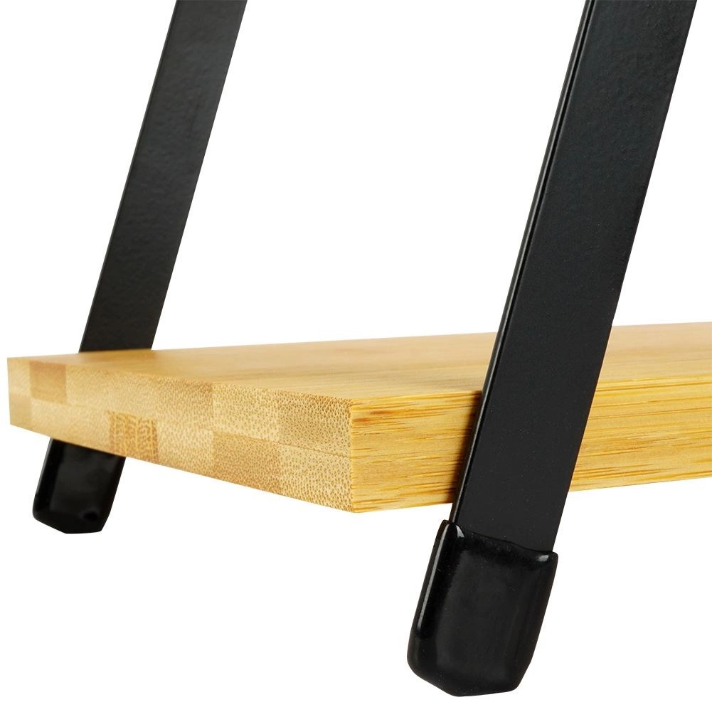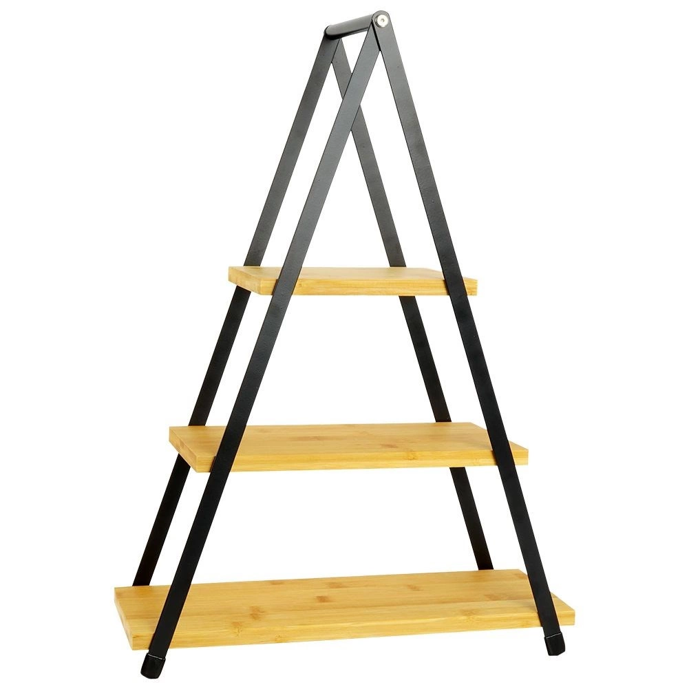 Elegante driedelige serveerétagère met zwart metalen frame en bamboe legplanken, ideaal voor desserts, fruit, kazen en canapés. Dankzij het driehoekige ontwerp bespaart hij ruimte, is hij stabiel, makkelijk te verplaatsen via de bovenste handgreep en past hij perfect in zowel moderne als industriële interieurs.