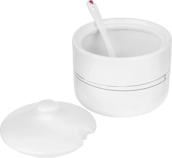 Gemaakt van hoogwaardige witte keramiek die gemakkelijk schoon te maken is. De suikerpot en het lepeltje zijn vaatwasserbestendig.