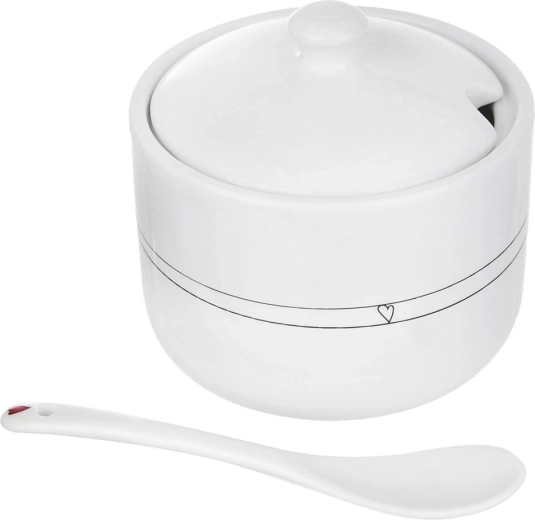 Elegante witte keramische suikerpot met een inhoud van 300 ml en deksel en lepeltje is een praktische toevoeging voor het serveren van suiker en kruiden. Het eenvoudige ontwerp met een fijne lijn en hartje siert elke keuken; het deksel met een uitsparing voor het lepeltje maakt gebruik en opslag gemakkelijk. Vaatwasserbestendig voor eenvoudig onderhoud.